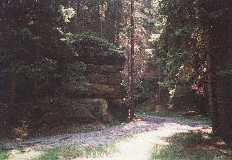 místy k vidění pěkné pískovcové skály. Po asi kilometru se našemu pohledu zjeví na levé straně pěkná skála,