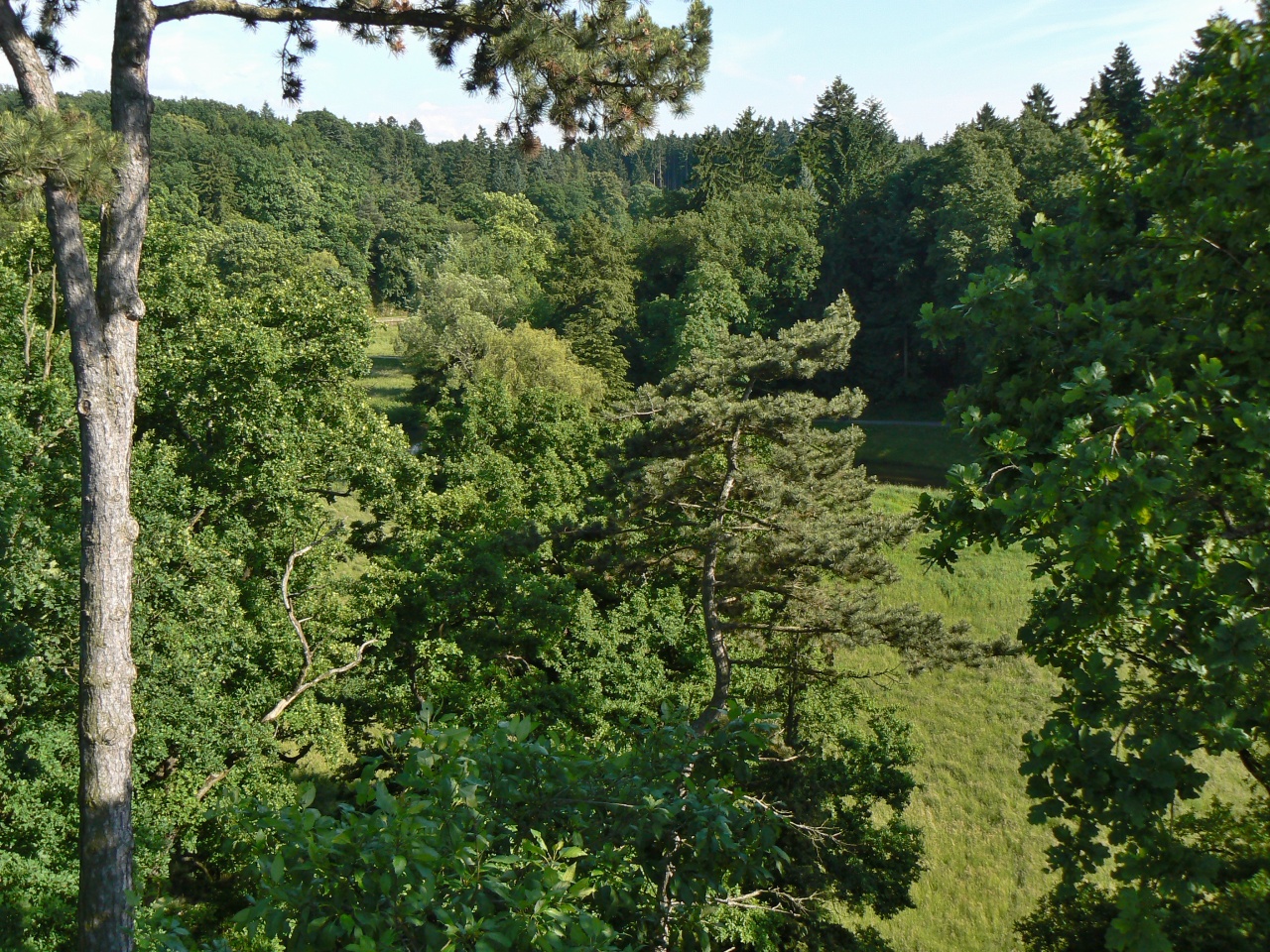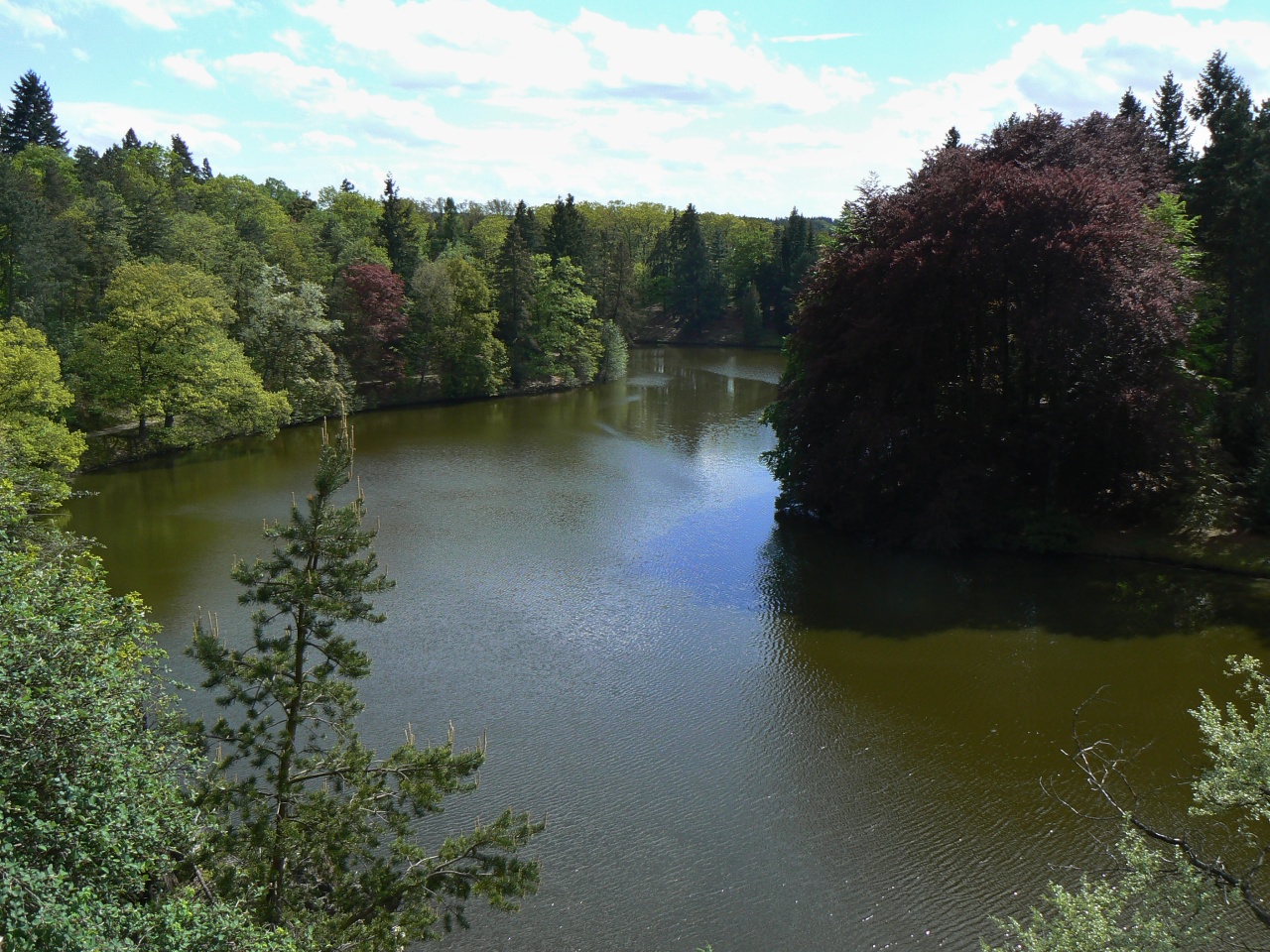 Ale tam už my návštěvníci přístup nemáme. V klidu a míru se tu na sluníčku na příjemných lehátkách naobědváme a pak pokračujeme v cestě za dalšími divy Průhonického parku. Cesta nás vede lesem vysoko nad údolím.