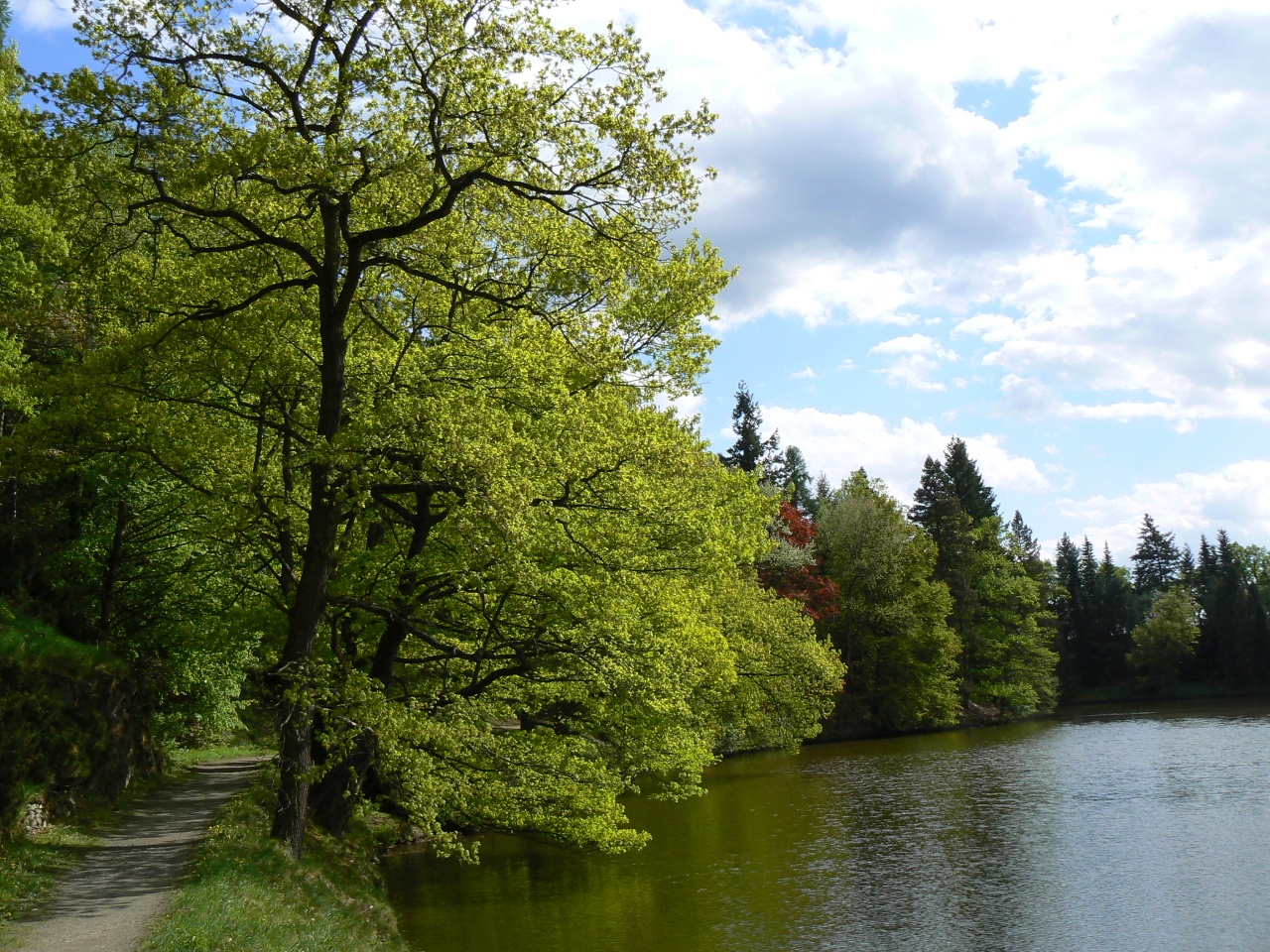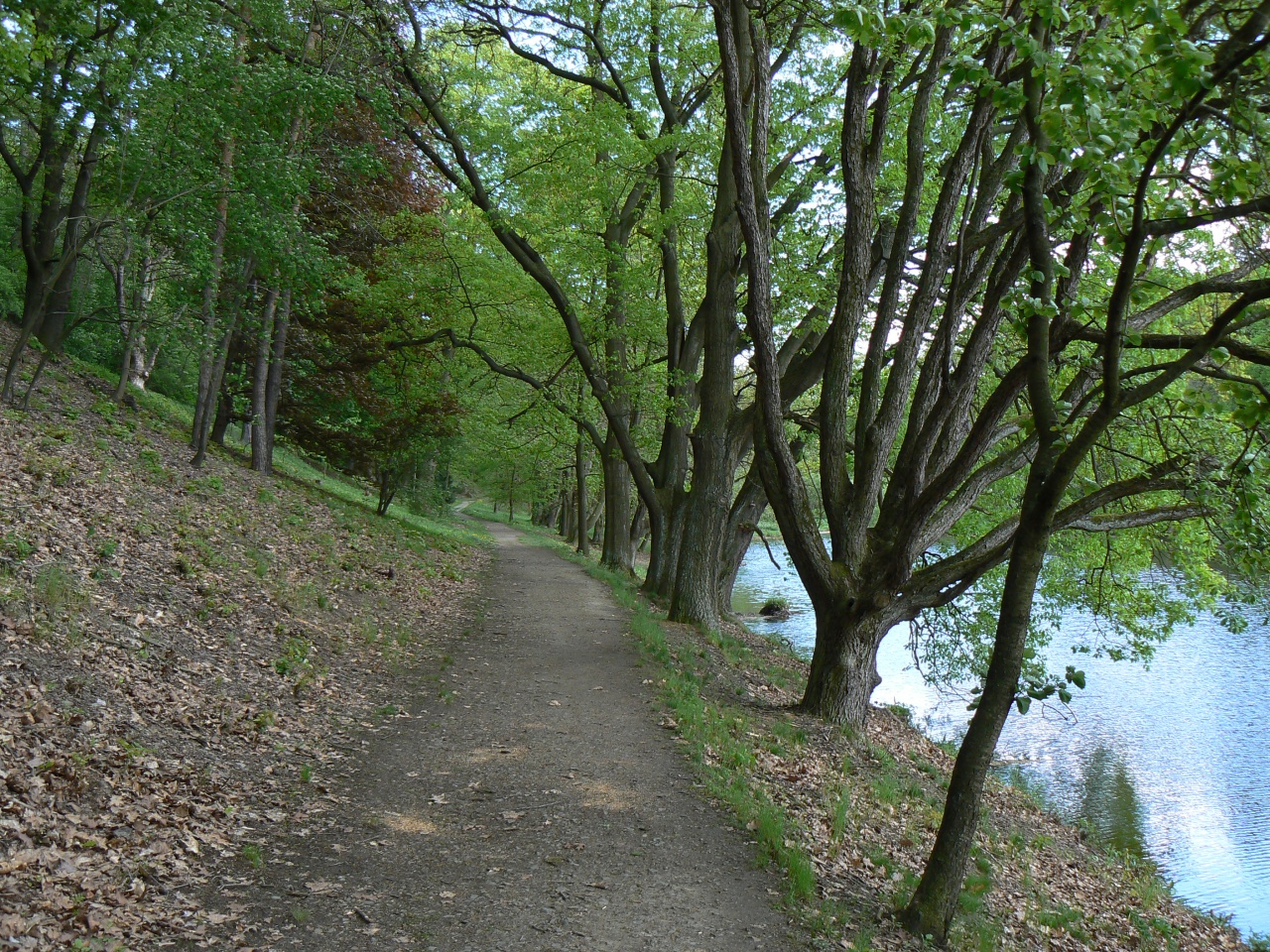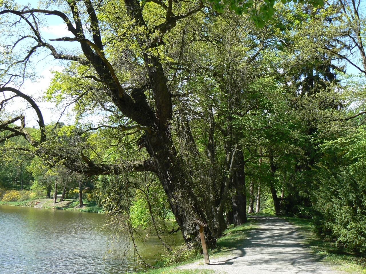 Přecházíme silnici, která dělí park na dvě nestejně velké poloviny, stoupáme do mírného kopečka a brzy stojíme na hrázi velkého rybníka, který nese příjemně znějící jméno Labeška. Jeho hráz zpevňují nádherné staré stromy.