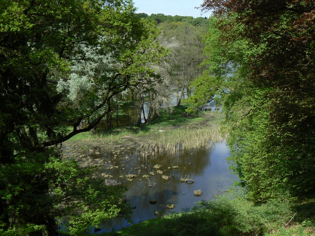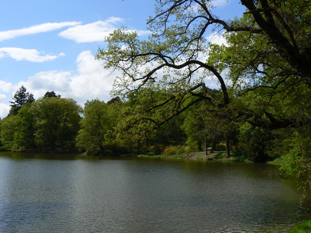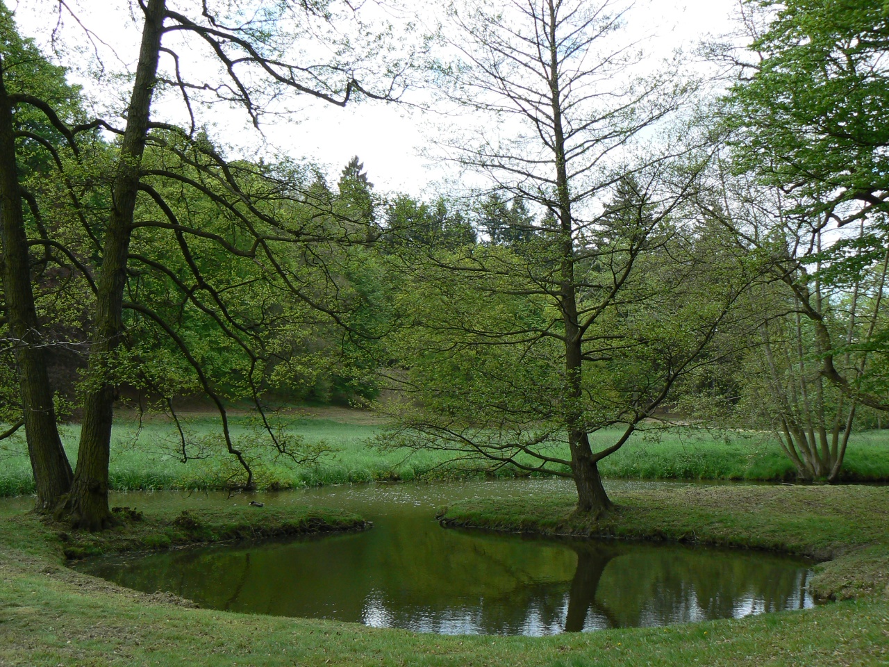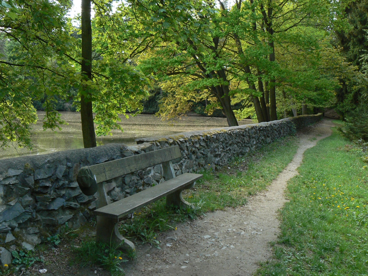 Přecházíme silnici, která dělí park na dvě nestejně velké poloviny, stoupáme do mírného kopečka a brzy stojíme na hrázi velkého rybníka, který nese příjemně znějící jméno Labeška. Jeho hráz zpevňují nádherné staré stromy.