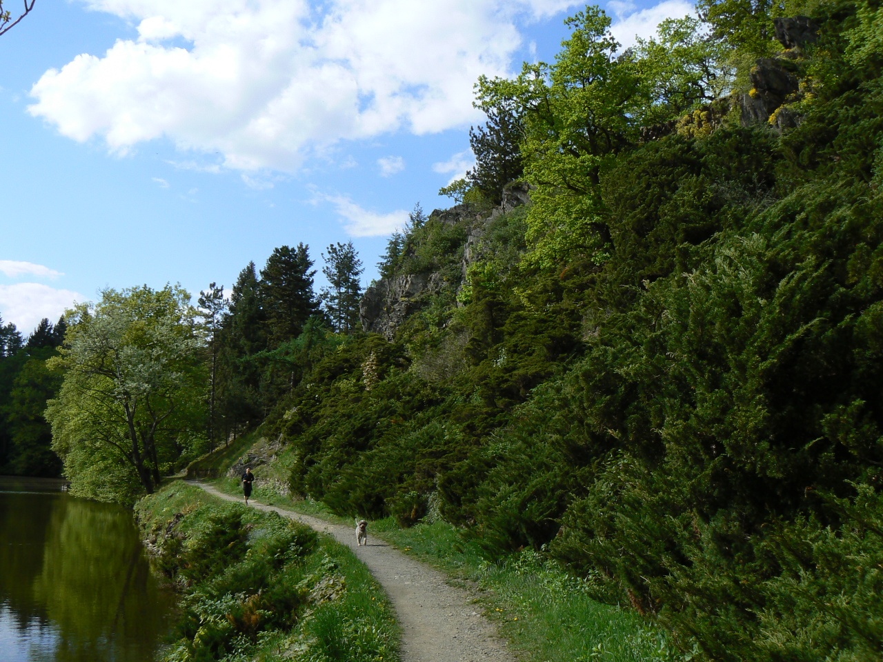 Cesta nás však nevede po hrázi, vede nás přes můstek, do stráně a do lesa.