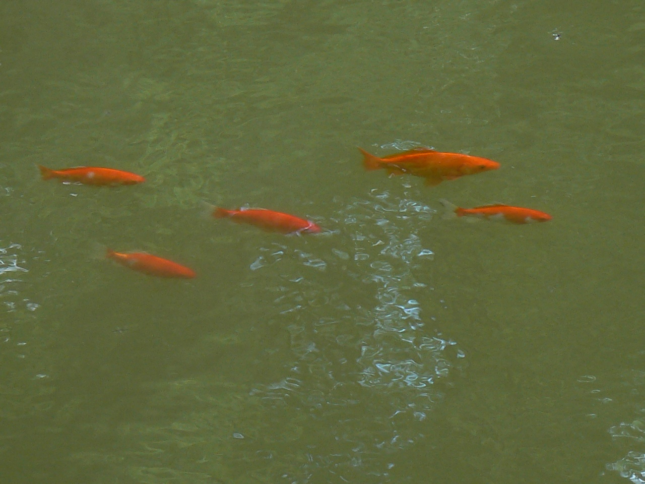 ...a v něm oranžoví koi kapříci. Ti se ale moc neskrývají - proplouvají se u hladiny a zvědavě se dívají, jestli jim nejdeme házet nějaké drobečky.
