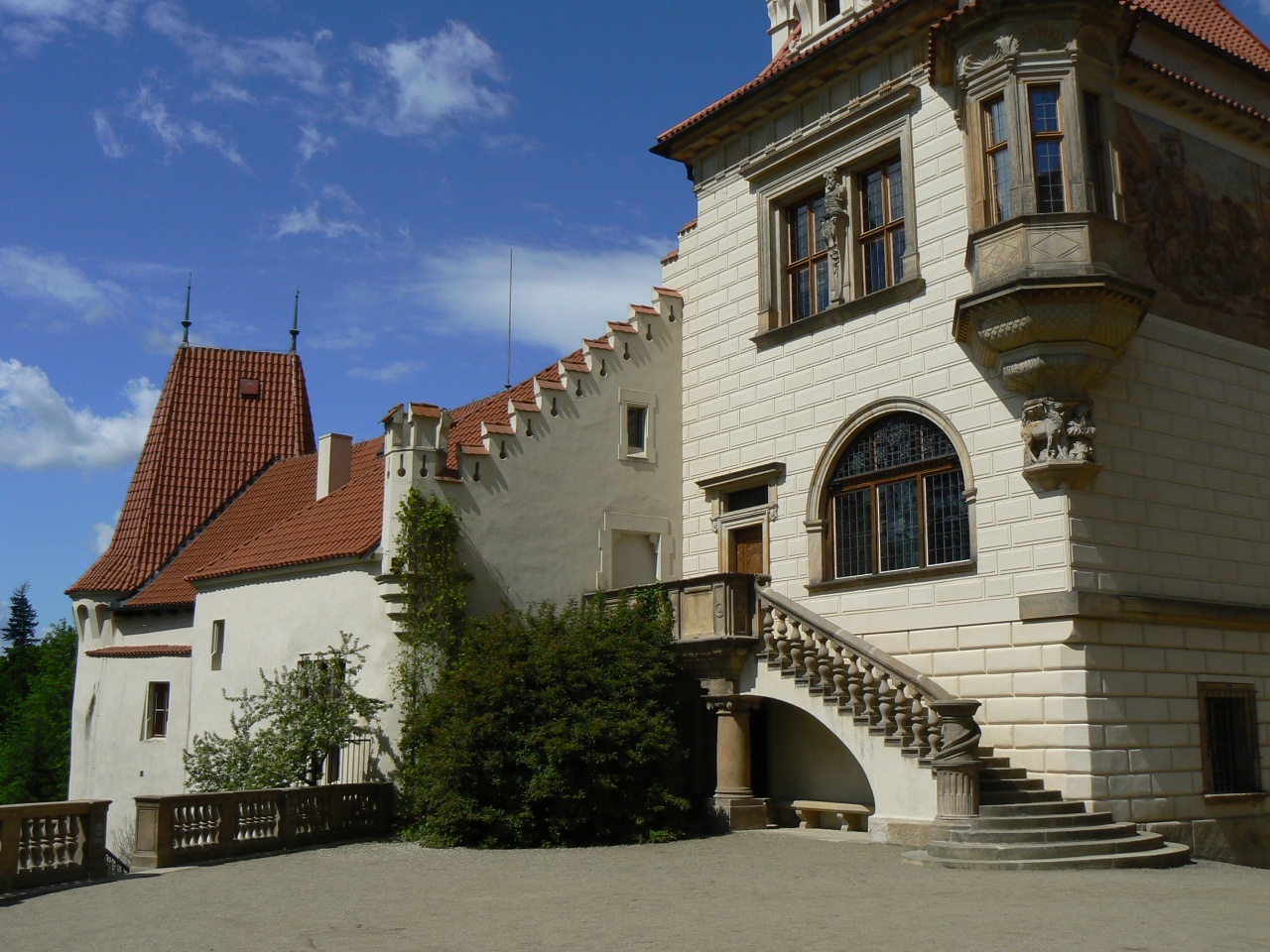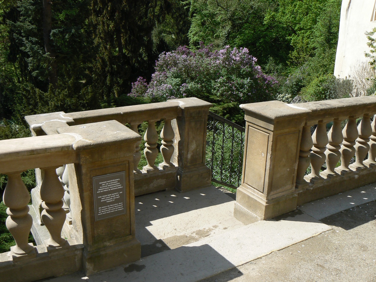 Tyhle schody a dveře a velké okno... a taky ta zeď s romantickým cimbuřím... to by možná mohlo připadat povědomé i těm, kteří v Průhonicích nikdy nebyli.