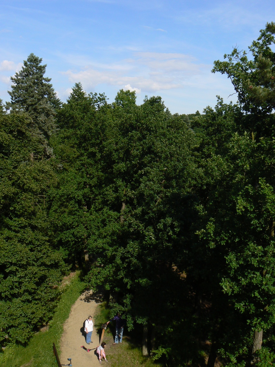 Po chvíli cesty jsme nahoře. Vystoupáme po schodech po vnější straně Glorietu na vyhlídkovou plošinu. Odměněni jsme výhledem na okolní stromy.