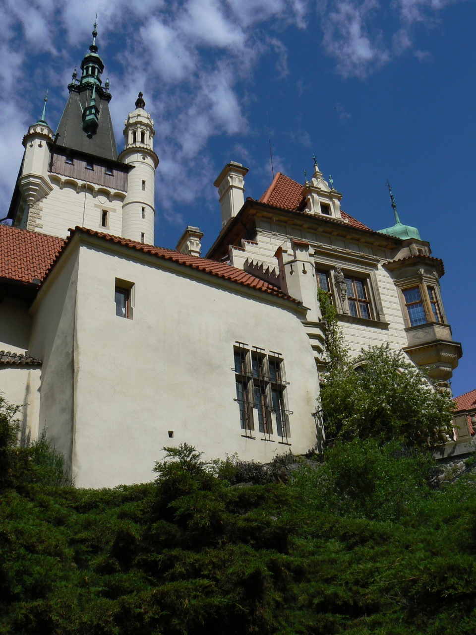 Na místě zámku byla ve stejné době postavená tvrz, která se postupně stala hradem a nakonce zámkem. Až do druhé poloviny 19. století byl zámek budovou spíš takovou nijak zvlášť zdobenou, architektonicky zajímavou, ale Arnošt Emanuel hrabě Silva-Tarouca ho nechal přestavět v romantickém stylu, napodobujícím historické slohy a tím vznikla nádherná stavba.