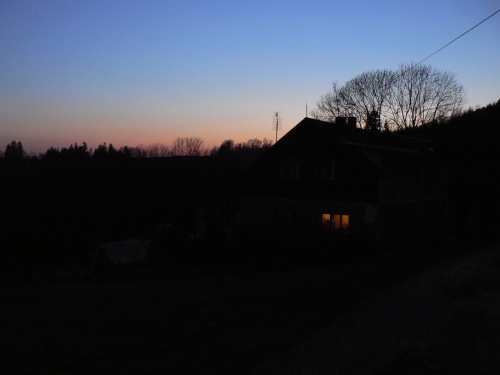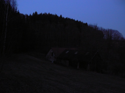 Nad Čertovým mlýnem chvíli poslouchám, ale do ticha zní jen šumění Bělé, ne pleskání karet a hlášky jako „Seš trop!“, „Bereš štyry!“ a podobné. Čerti nikoho o duši zrovna neobehrávají, tak radši půjdu, aby nezlákali ke hře právě mě. V lese u můstku přes Bělou už skoro nic nevidím, ale zato ta vůně! Kolem Sovinky kvetla spousta bledulek, ale v tomhle údolí jich kvetou bez přehánění lány. Původně jsem si plánoval dneska po cestě zpátky vyrazit tady kousek proti proudu Bělé a vyfotografovat si její nejpěknější vodopád, protože je teď víc vody než bylo loni - ale tma přišla dřív, než jsem čekal. Proto pokračuju v cestě na protější kopec. V domě nad lesem jeho obyvatelé už rozsvítili a působí to příjemným, poklidným dojmem.