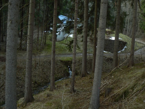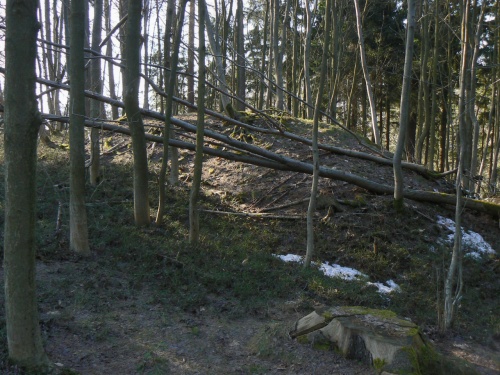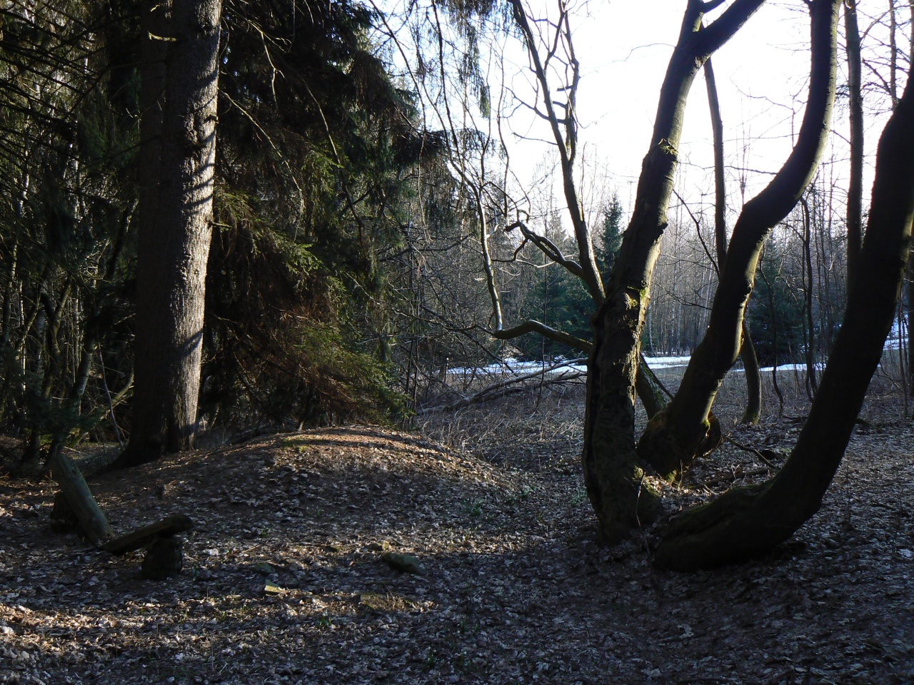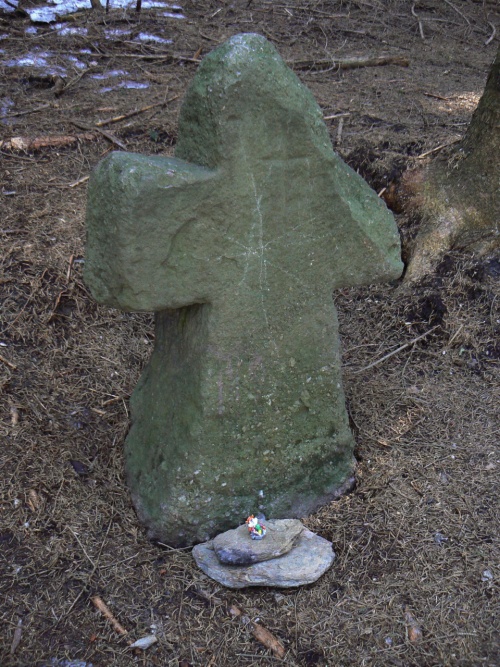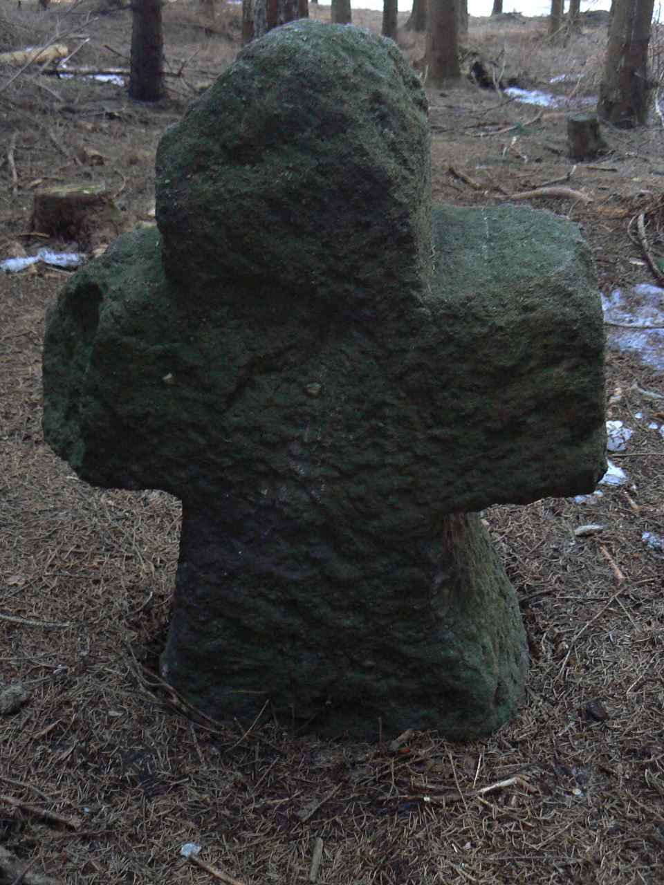 Přecházím parkoviště, hroužím se do lesa a po modře značené cestě procházím lesem. Cesta ve stinném lese je však pokrytá nepříjemně silnou vrstvou ledu a proto ji brzy opouštím. Jednak mě vede příliš doprava... a jednak je tady uprostřed lesa v mapě znak křížku. To se musí prozkoumat!