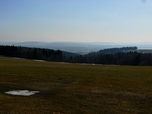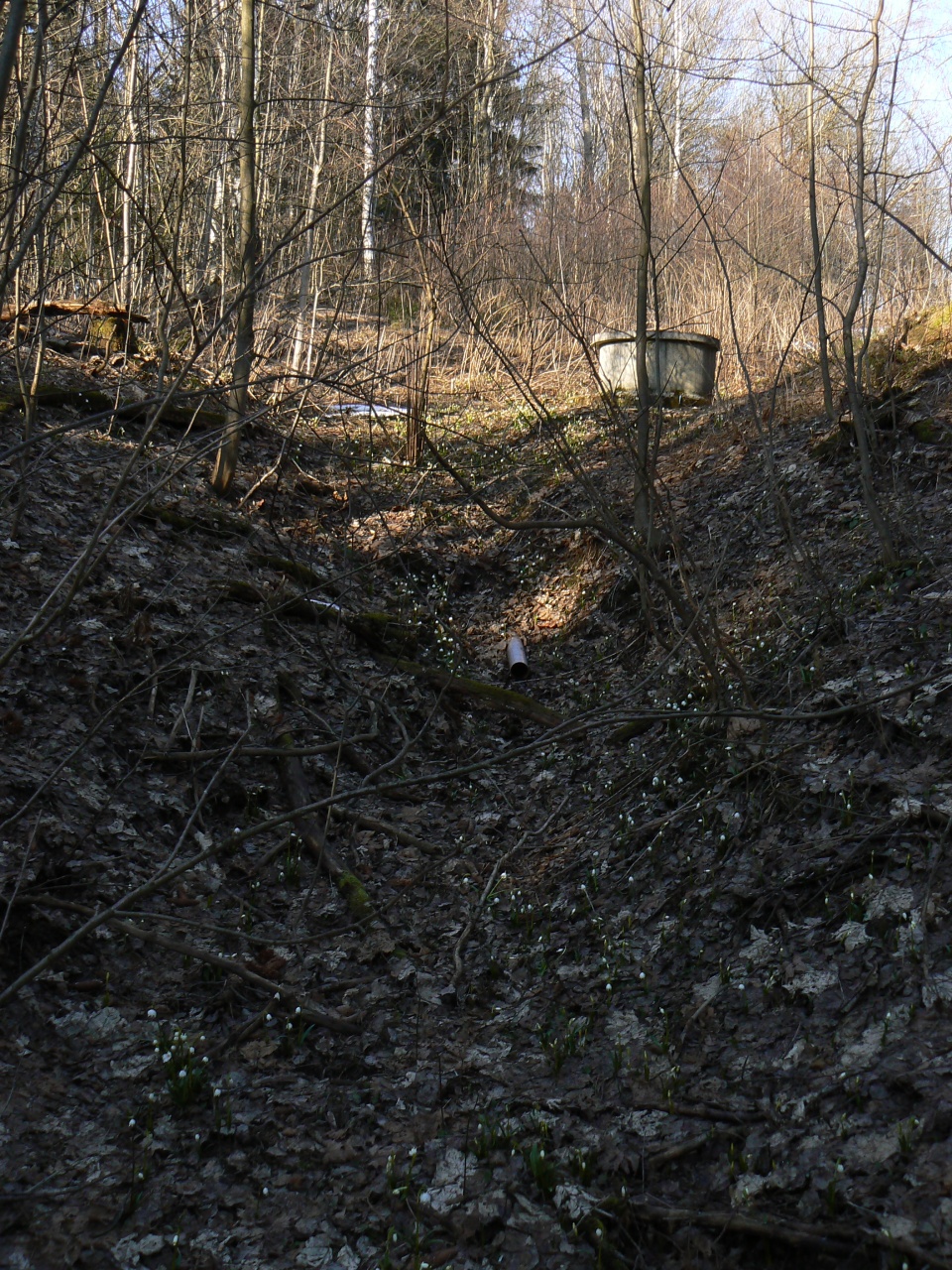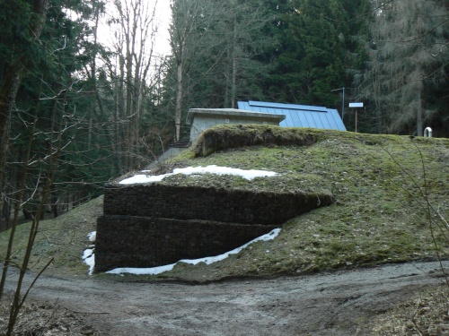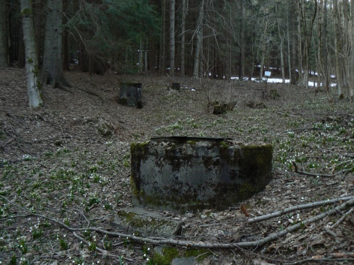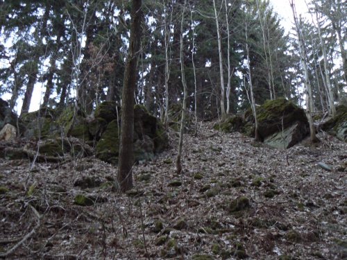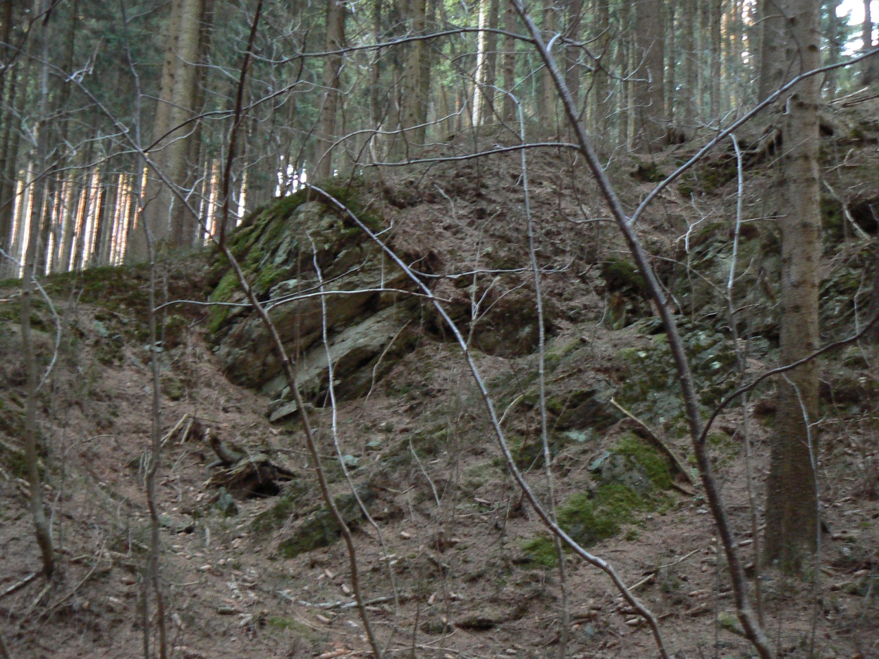 Přecházím parkoviště, hroužím se do lesa a po modře značené cestě procházím lesem. Cesta ve stinném lese je však pokrytá nepříjemně silnou vrstvou ledu a proto ji brzy opouštím. Jednak mě vede příliš doprava... a jednak je tady uprostřed lesa v mapě znak křížku. To se musí prozkoumat!