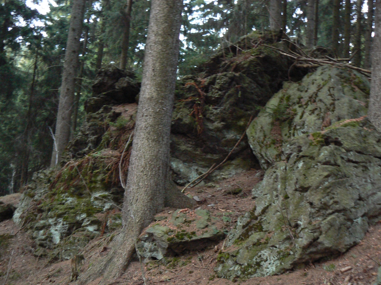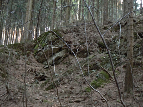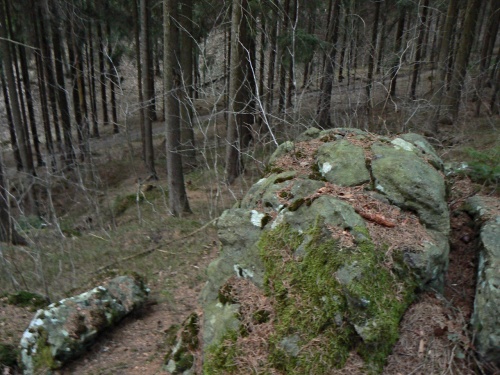Údolí je stále sevřenější a temnější, sluníčko se schovává za obzorem a les zaplnily podvečerní stíny. Drápu se ven z rokle schůdnější strání v protilehlém svahu až na cestu a když se po levé straně objeví skály, vím, že jsem na dalším zajímavé místě.