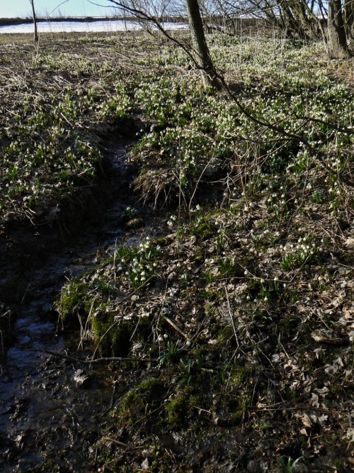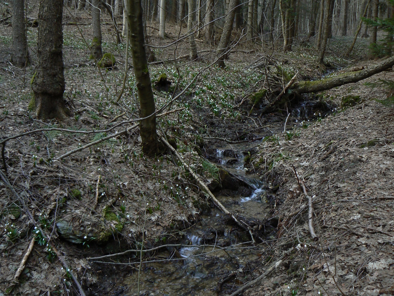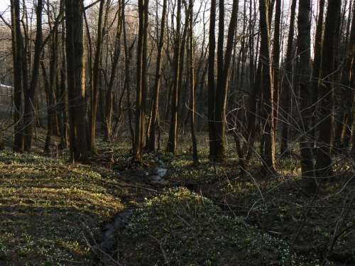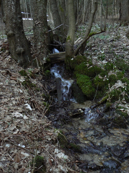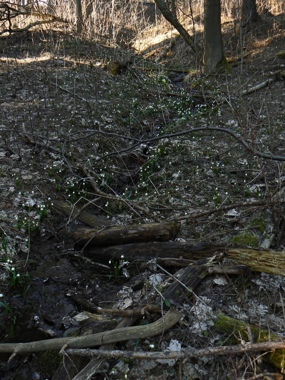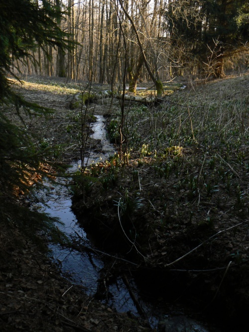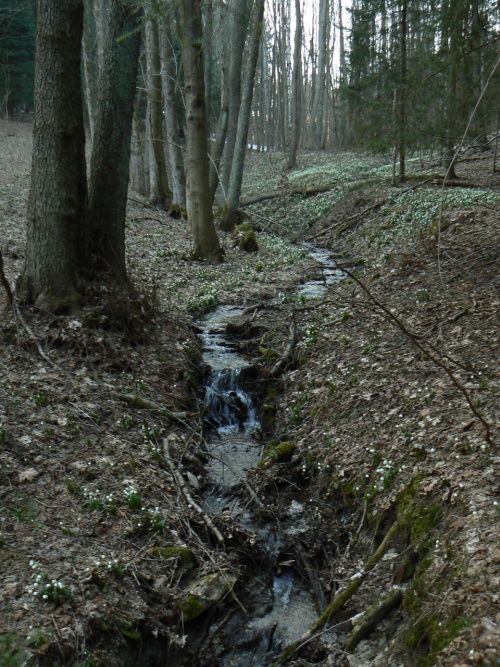 Vypadá mnohem silnější a taky krásnější než ten, kolem kterého jsem přišel, tak nemůže zůstat neprozkoumaný. Ženu se tedy s chutí podél něj znovu do téhož kopce, z něhož jsem právě sešel. Často se tu stékají různé pramínky, ale všechny většinou rychle končí někde okolo v záhonu nádherných bledulek. Jen jeden jediný pokračuje dál a dál.