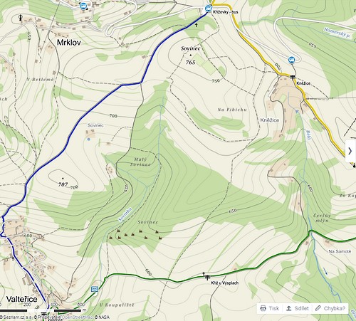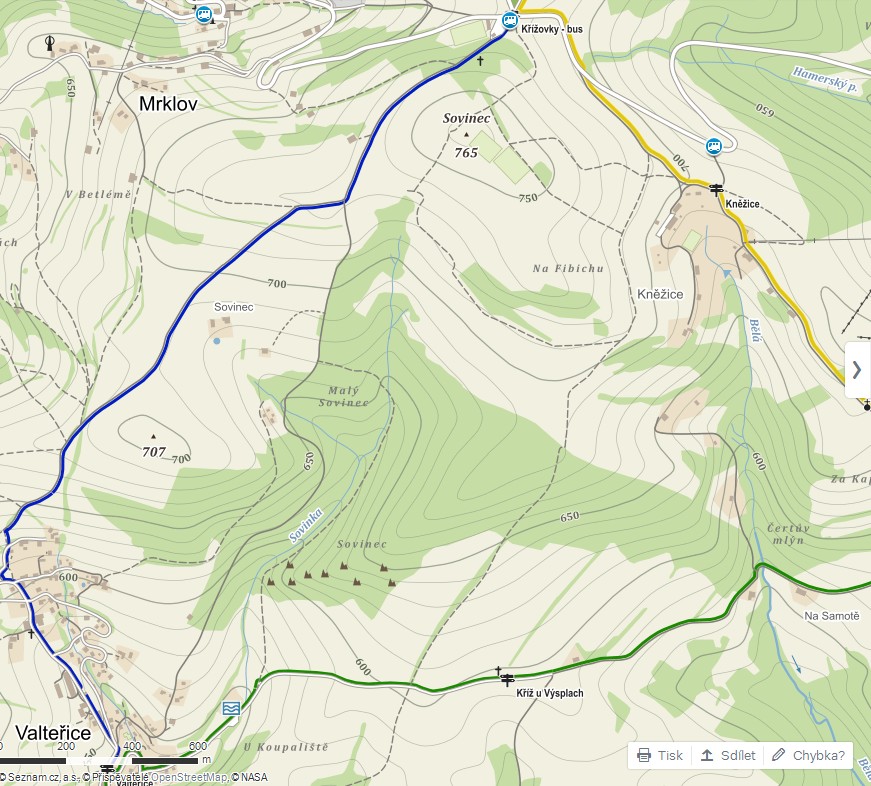 Když jsem loni šel k pramenům Bělé, šel jsou ve dvou dnech od soutoku až k prameni. U Sovinky by to samozřejmě šlo taky, ale byla by to cesta převážně mezi domy, kde je Sovinka regulovaná a srovnaná a protéká buď podél silnice nebo v zahradách. Proto dnes spolu vyrazíme z Křížovek, pokusíme se dojít rovnou k prameni a pak jít podél nejdivočejší části Sovinky až do Valateřic.