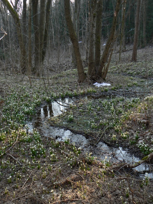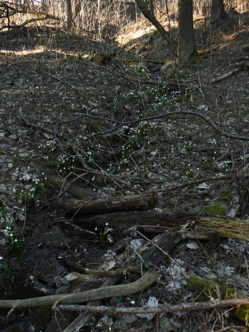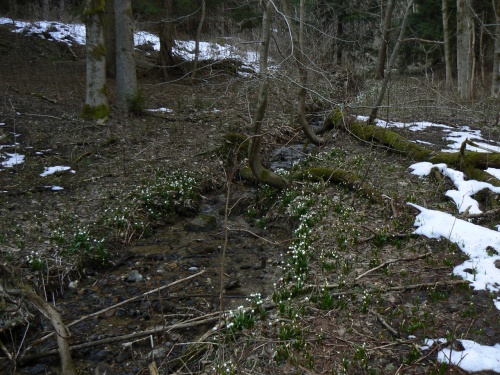 Chvíli tu ještě postávám a dívám se a pak pokračuju vlhkým korytem dolů z kopce. Po kousku cesty mě upoutá šumění vody zprava a zjistím, že se sem připojuje další pramen, ve kterém vesele zurčí voda a je hustě lemovaný kvetoucími bledulkami.