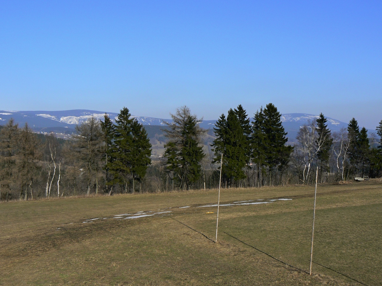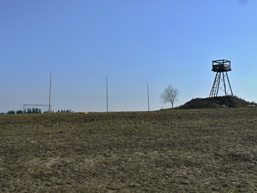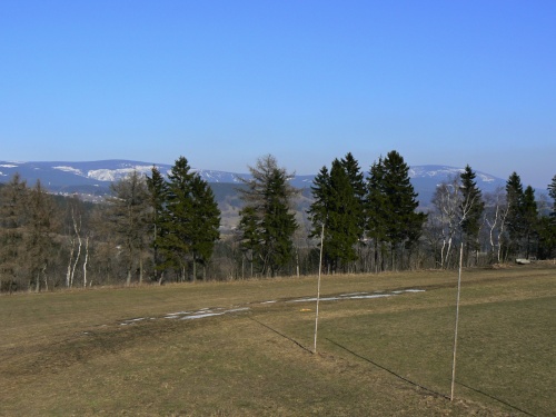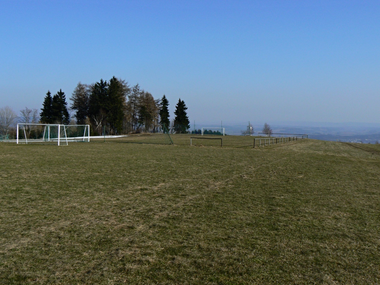 Teprve když přijdu blíž, všimnu si branky a zjistím, že na tomhle výjimečném místě je celé fotbalové hřiště a tahle stavbička je možná místo pro trenéry, možná je to tribuna pro významné hosty nebo komentátorské stanoviště. Teď tu nikdo nehraje a nemá co pískat ani komentovat, tak si tam lezu já a komentuju co vidím. Nejlíp je odtud vidět sousední hora Žalý.