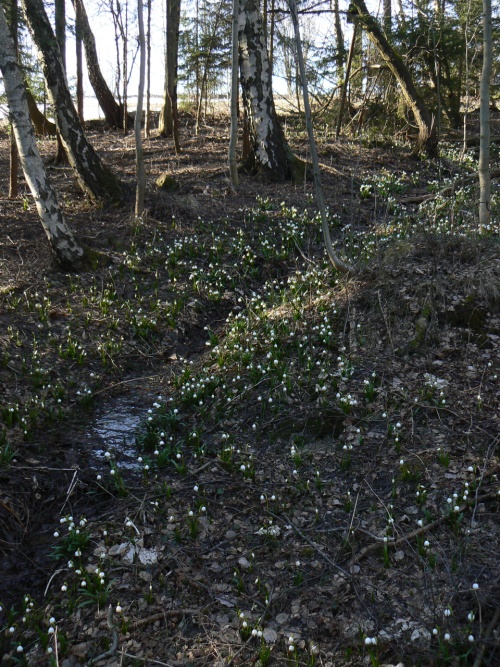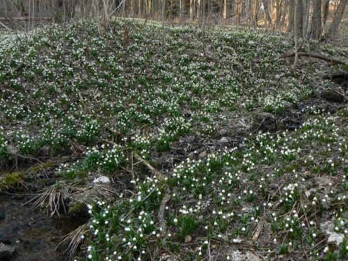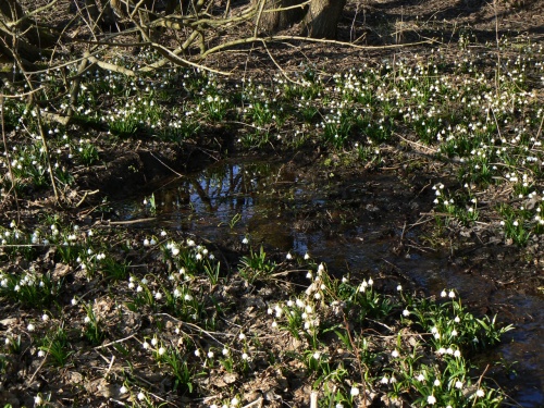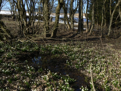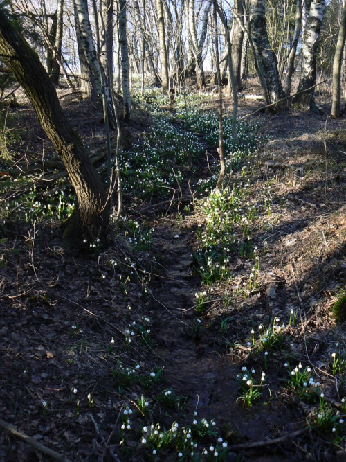 Lesem je čím dál těžší projít - pramínky se spojují a rozdělují a celý les je jedním kobercem krásných bledulek. Chodím mezi nimi stylem baletek, ale jsou místa, která musím obejít až daleko od Sovinky, tolik bledulek tam je.
