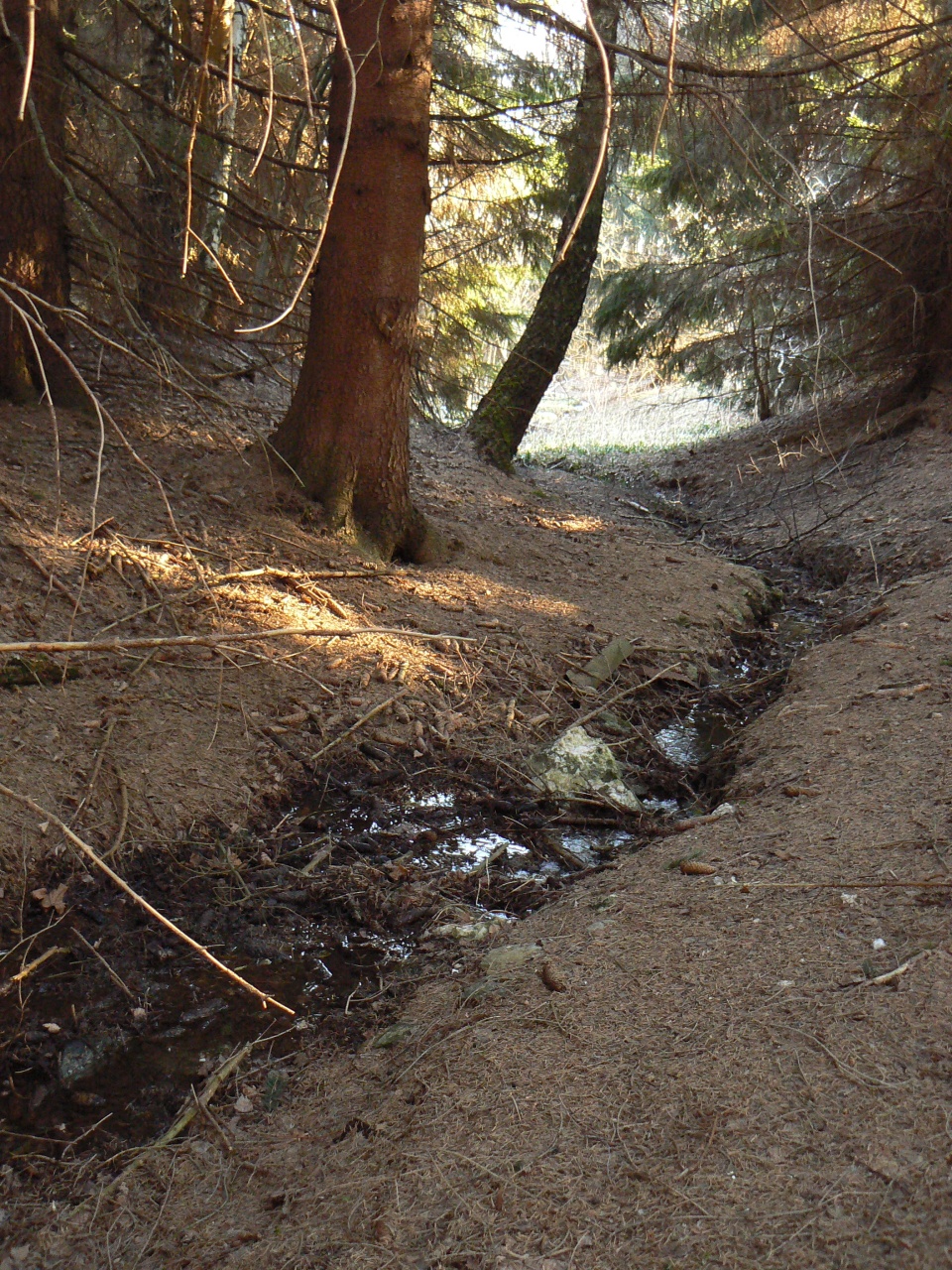 Ale kdepak, to by nebylo ono. Místo toho prochodím přilehlý lesík křížem krážem a brzy nacházím podobných studen ještě několik. Jak postupuju níž, narážím i na vyschlé koryto, na Sovinku dočista do poslední kapky vypitou.