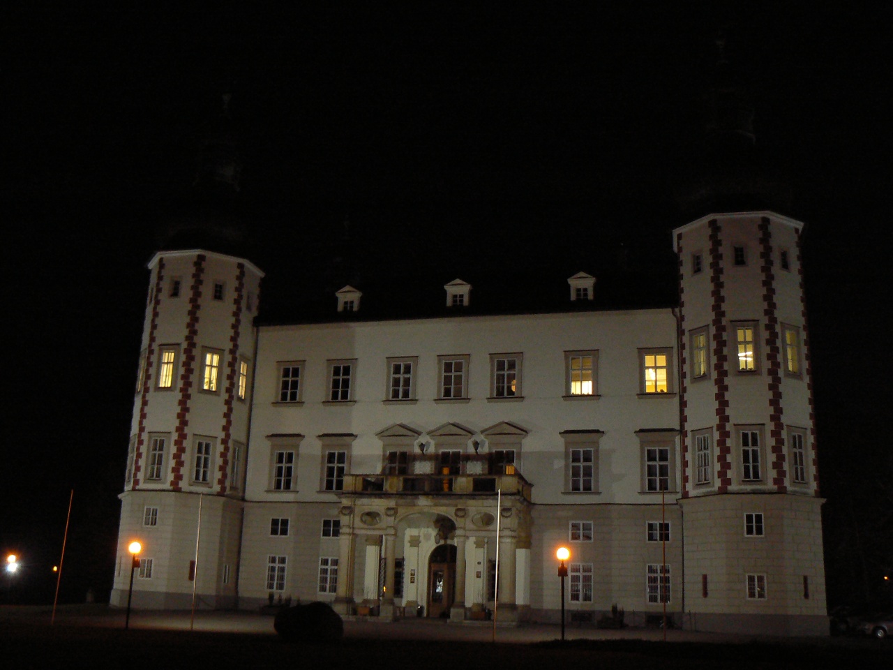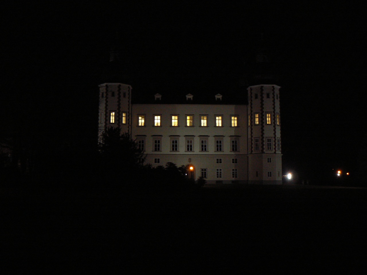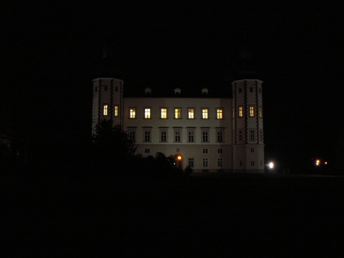 Cesta do Vrchlabí už je odtud pořád z kopce a je docela příjemná. Poslední zajímavou věcí jsou pro mě rozzářená okna zámku.