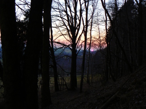 Proto odbočuju a klesám k okraji lesa. Tam právě krásné rudé slunce mizí za vrchy nad Valteřicemi.