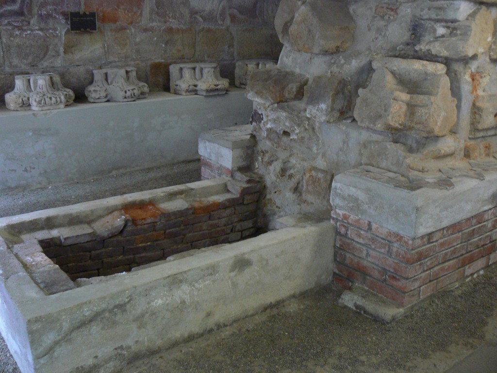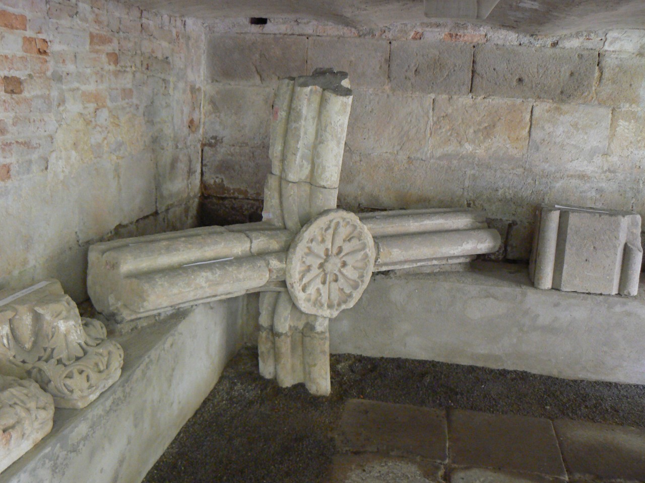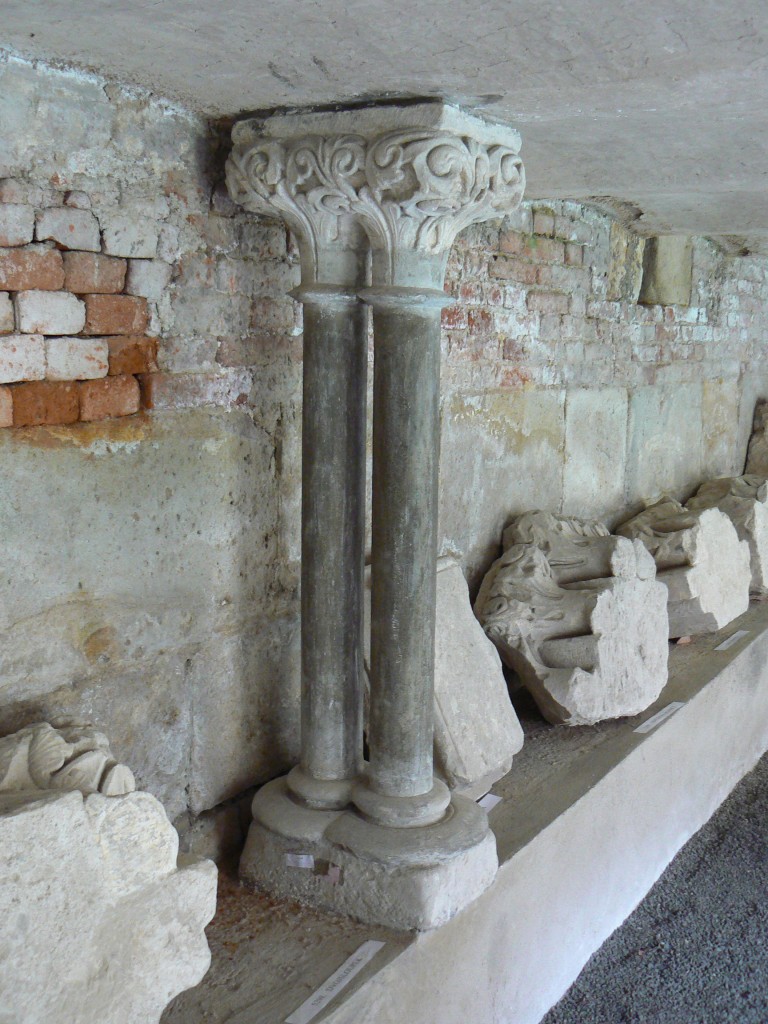 Obcházíme apsidy a za nimi sestupujeme po moderním schodišti do podzemí. Platíme vstupné a dveřmi vstupujeme do dlouhé chodby - někdejší románské křížové chodby. Po obou stranách chodby jsou vystavené různé úchvatné architektonické články, vykopané při odvodňovacích pracech - sloupky, hlavice, žebra kleneb, záklenky... ale jsou tu k vidění i krásné románské portály, které se zachovaly na svých původních místech. Takovéhle krásné sloupky kdysi podpíraly arkády křížové chodby.