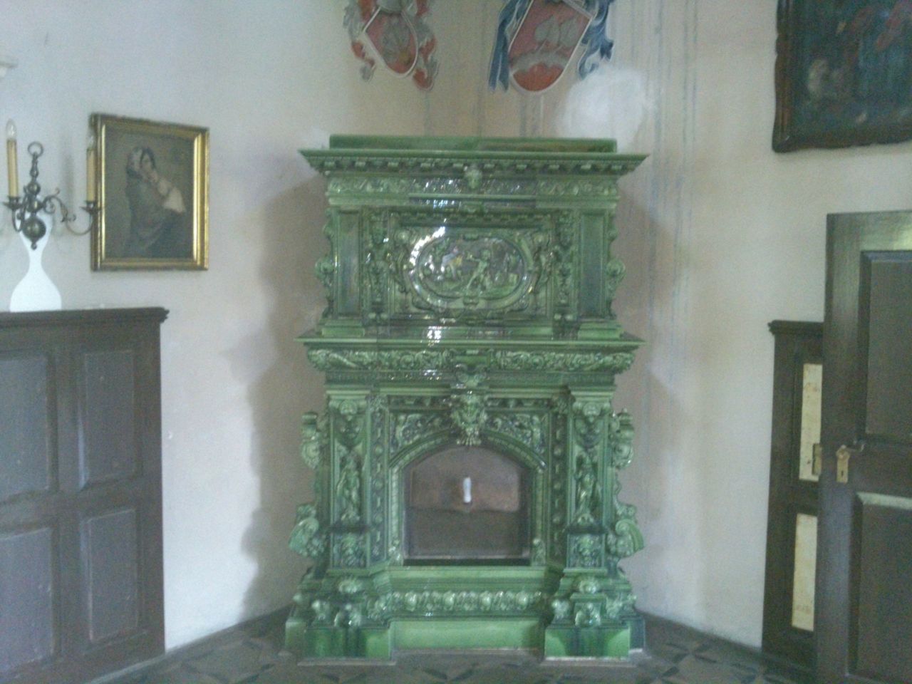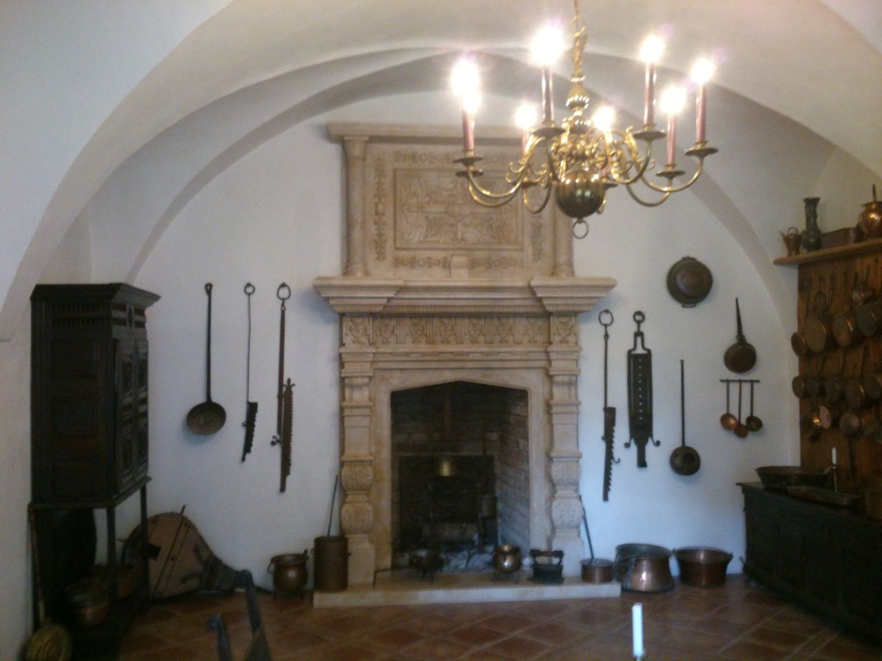 Nezdálo se mi, že by byl v kuchyni takový krásný, zdobený krb... ale asi se opravdu z někdejší parádní místnosti kuchyně stala, protože v krbu je tyč na zavěšování kotlů a hrnců i háky na uzení masa.