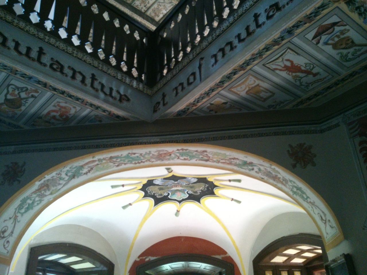 Nádherně malovaný je i spodek ochozu - jsou na něm desítky znaků tehdejších rodů, které však malíř z neznámých důvodů pozměnil a popletl - i stěny okolo.