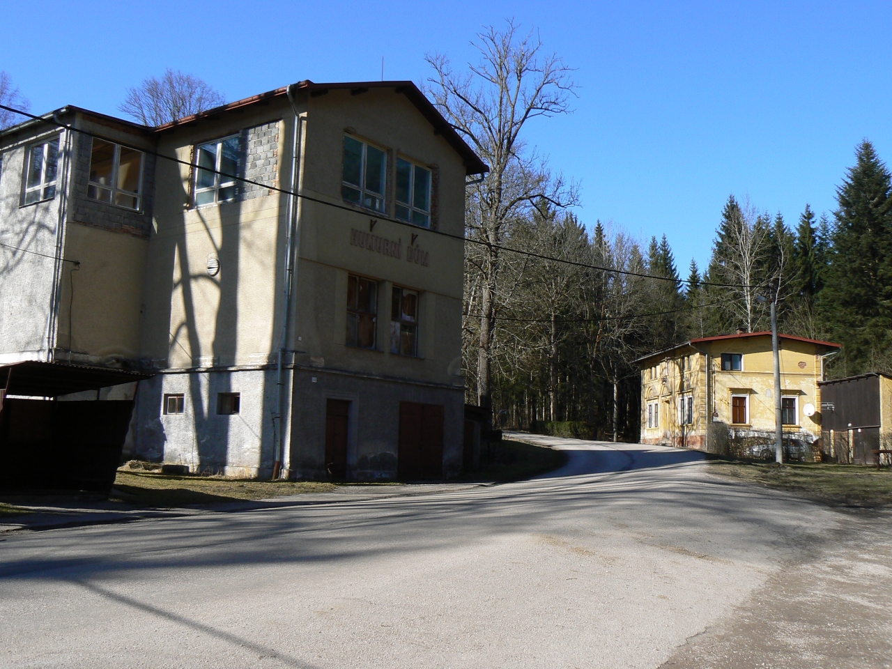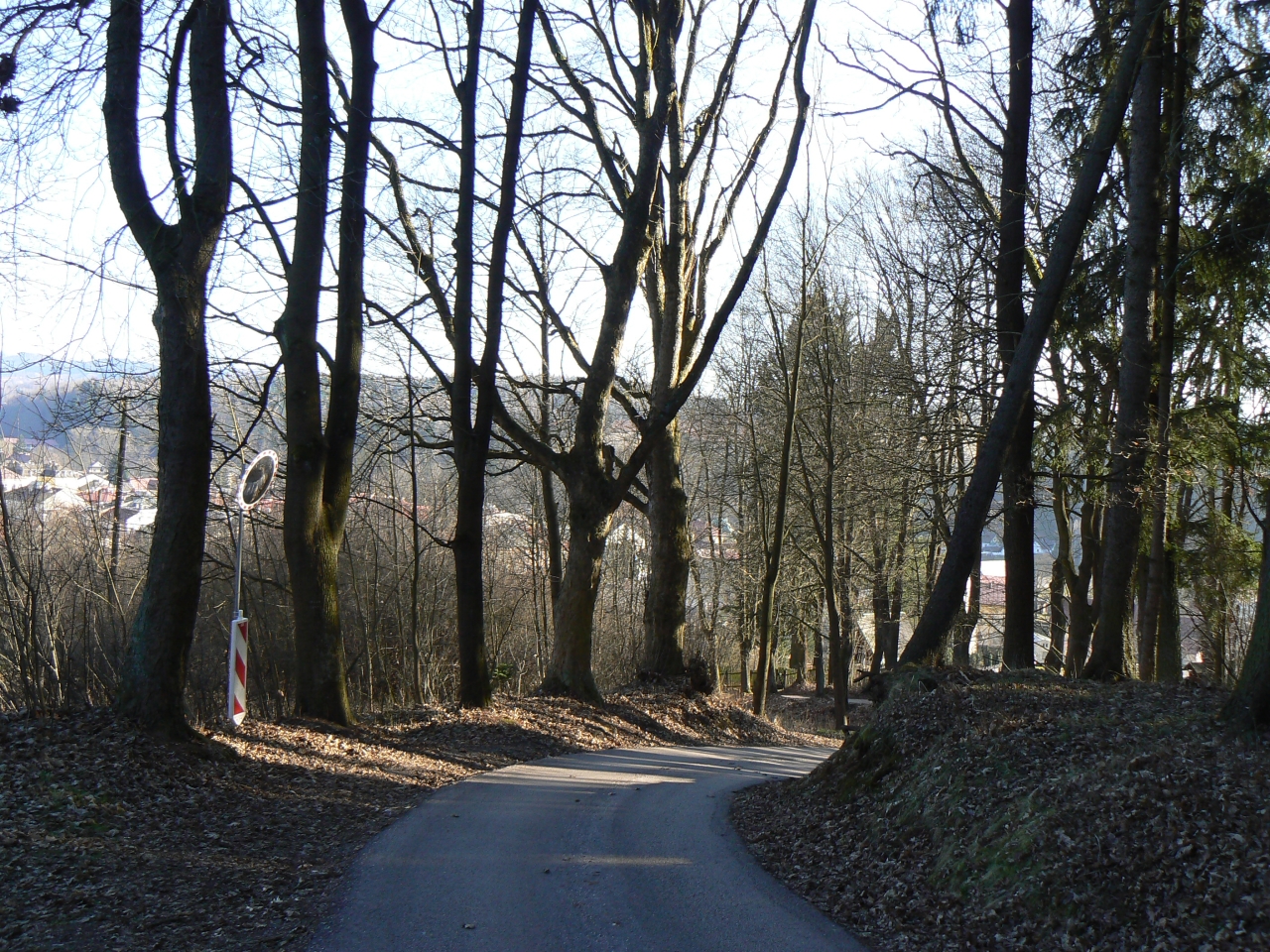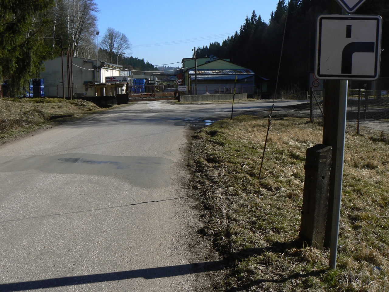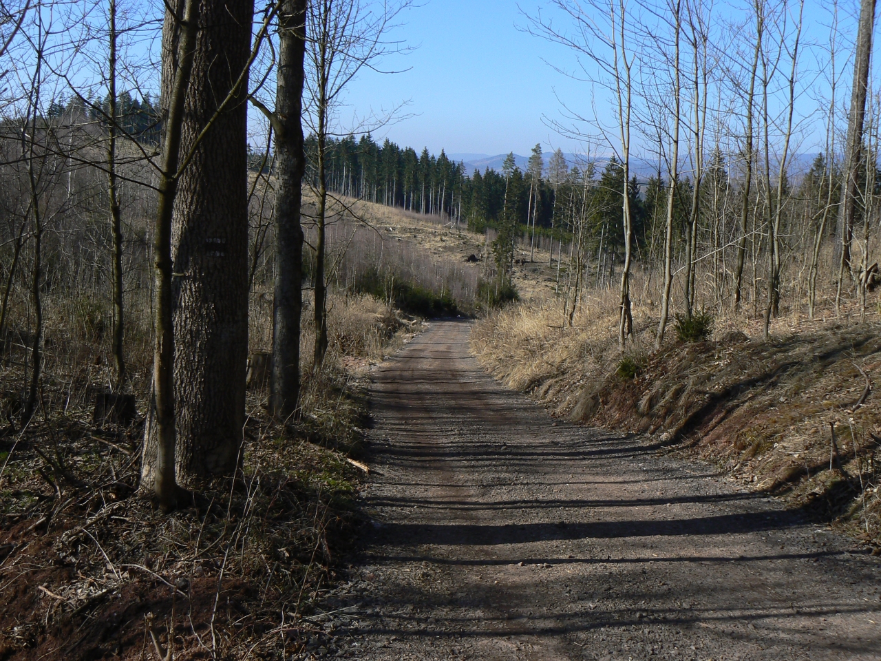 Za posledními chatami se stáčí poměrně nenápadná cesta doprava, podchází chaty a pokračuje do lesa. Dnes po ní lidé asi moc nechodí, ale stále je dobře znatelná. Před 17ti lety tu byla spousta zbytků značek, ale všechny byly zamalované hnědou barvou, která dnes nějak splynula s kůrou stromů a já nemůžu najít ani jeden. Orientace však není složitá - pokračujeme v chůzi po cestě až na křižovatku lesních cest a na ní se dáváme vlevo po širší lesní cestě, pokračující dál z kopce. Když se po naší levé ruce objeví louka, vedení zamalovanou šipkou odbočíme doleva po jejím okraji, sejdeme dolů a na spodním konci pokračujeme lesní cestou dál z kopce.