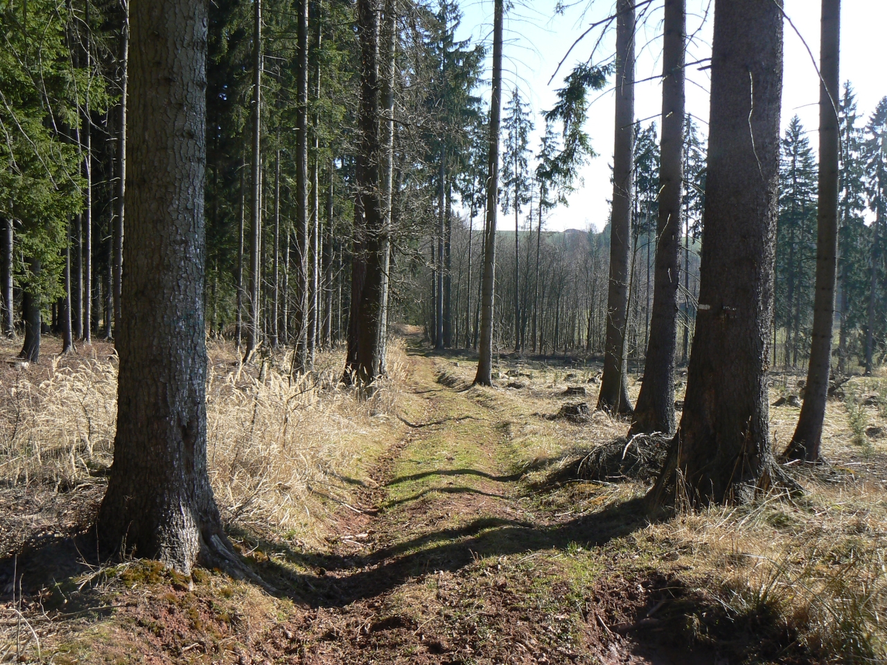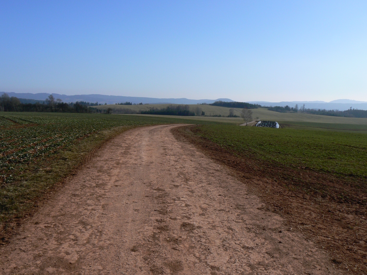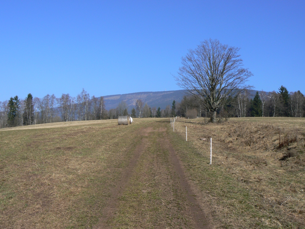 My se z cesty vydáme po silničce doprava, vystoupáme na nevýrazný vrchol vrchu Hřeben a na místě, kde silnička zachází do lesa odbočíme vlevo. Naštěstí pole nesahá až k okraji lesa, zbyl tu hodně široký pruh zarostlý travou, kterým vede i nevýrazná cesta. Po něm scházíme z kopce stále podél okraje lesa, mineme dva napůl vykácené lesíky a dole v údolí, kde se okraj lesa po naši pravé ruce stačí pasekou s mladými stromky doleva, začíná cesta, po které se vydáme a po které pravděpodobně vedla i červená značka.