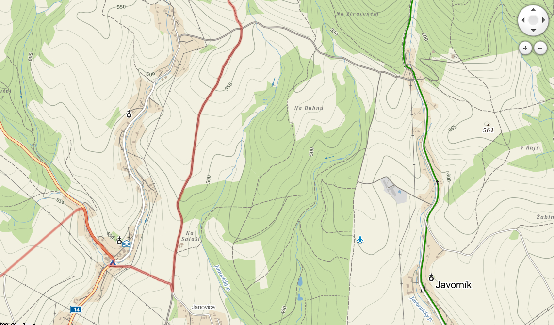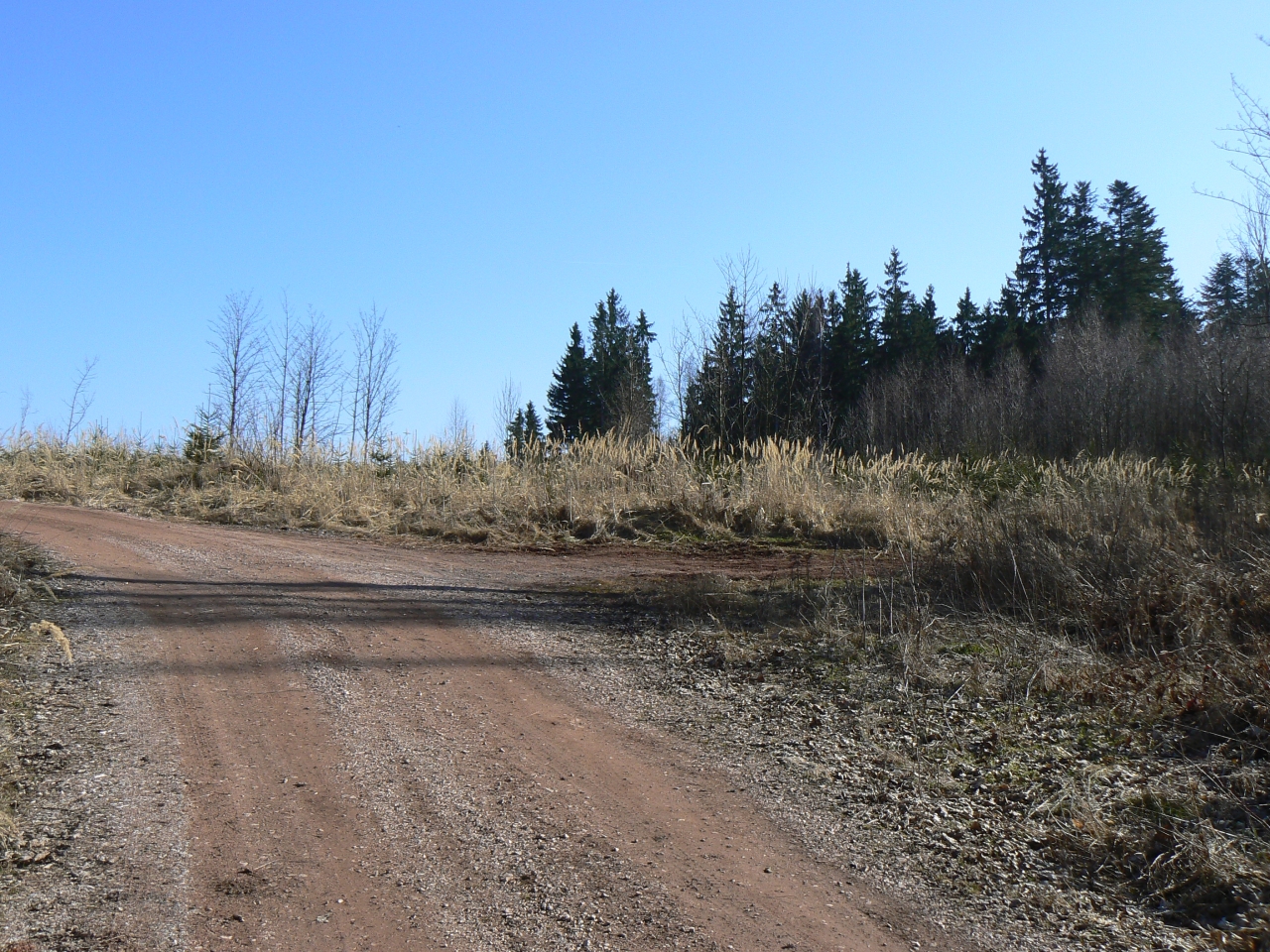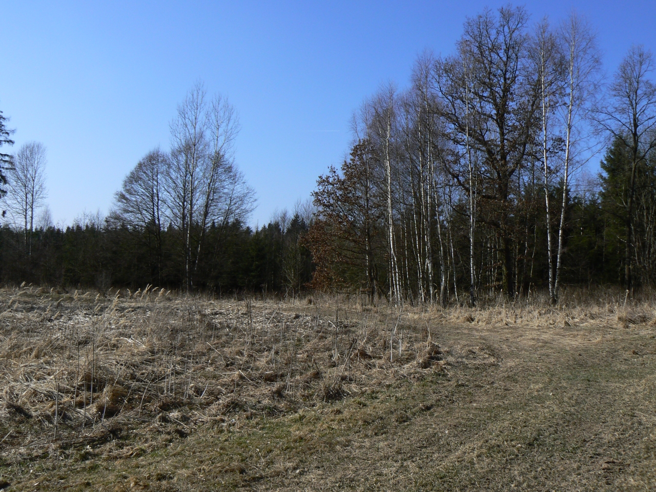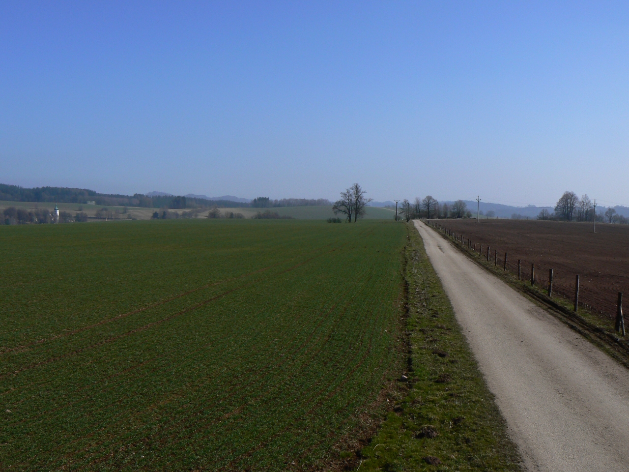 My se z cesty vydáme po silničce doprava, vystoupáme na nevýrazný vrchol vrchu Hřeben a na místě, kde silnička zachází do lesa odbočíme vlevo. Naštěstí pole nesahá až k okraji lesa, zbyl tu hodně široký pruh zarostlý travou, kterým vede i nevýrazná cesta. Po něm scházíme z kopce stále podél okraje lesa, mineme dva napůl vykácené lesíky a dole v údolí, kde se okraj lesa po naši pravé ruce stačí pasekou s mladými stromky doleva, začíná cesta, po které se vydáme a po které pravděpodobně vedla i červená značka.