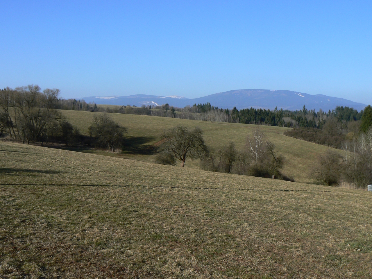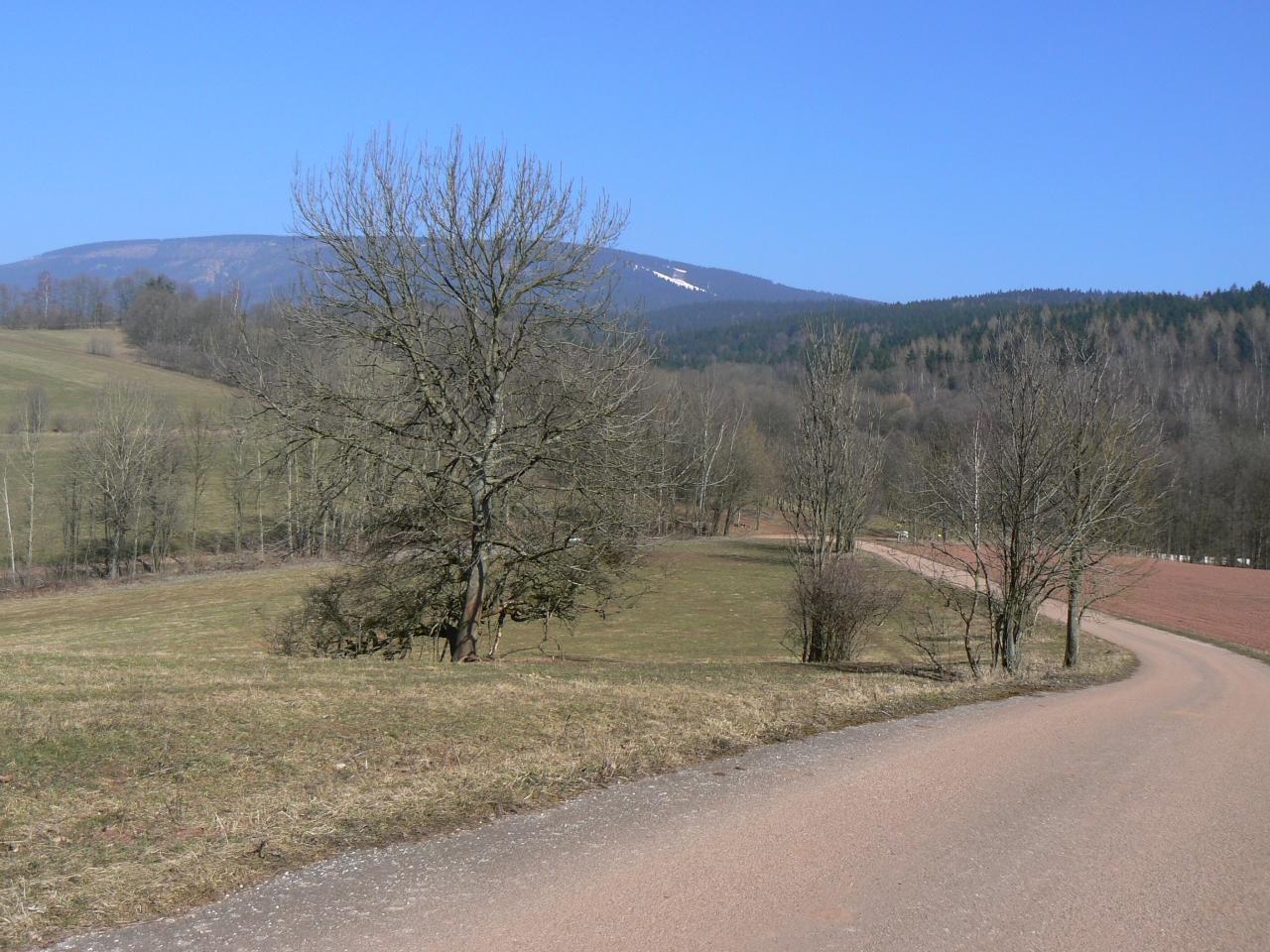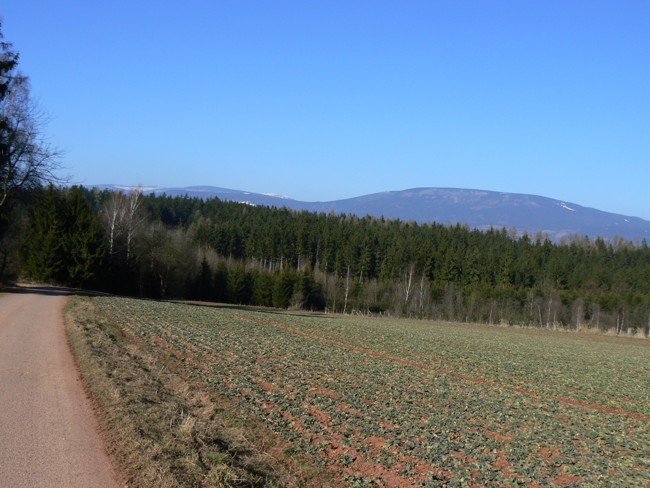 Odbočíme doprava po této cestě, projdeme hájkem až na louku a zde se po více či méně znatelné cestě stočíme doleva souběžně s okrajem lesa až k prvním domům, které vidíme před sebou. Tady začíná solidnější cesta po které sledujeme vrchol pohoří. I odtud je občas pěkný výhled.