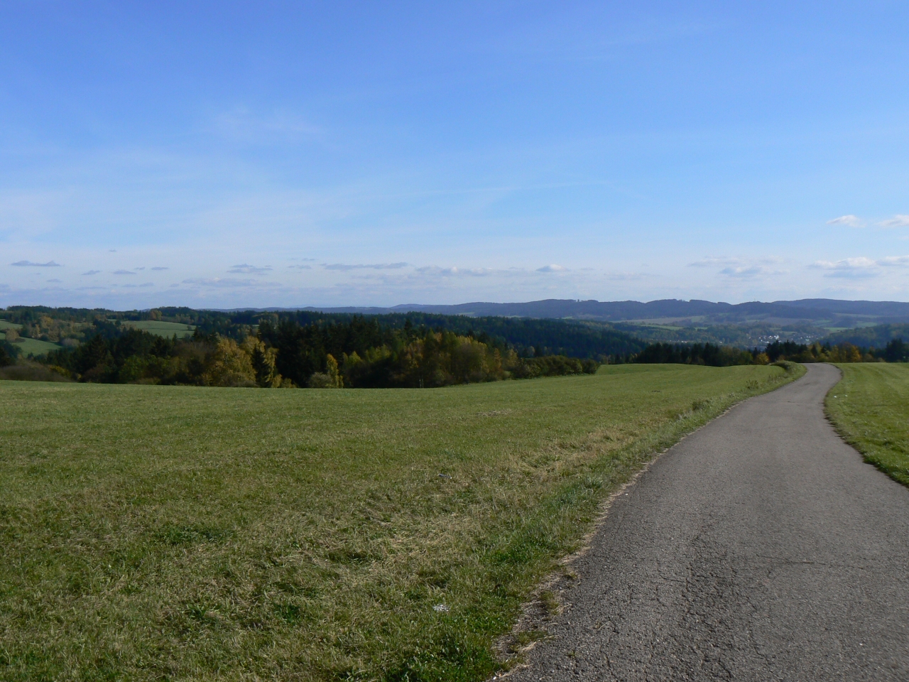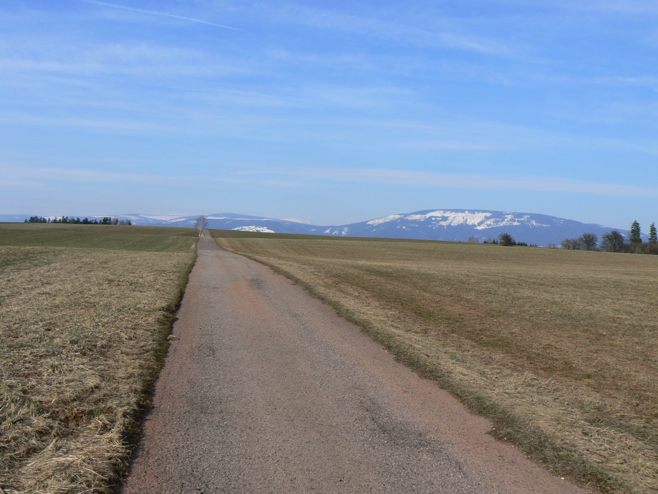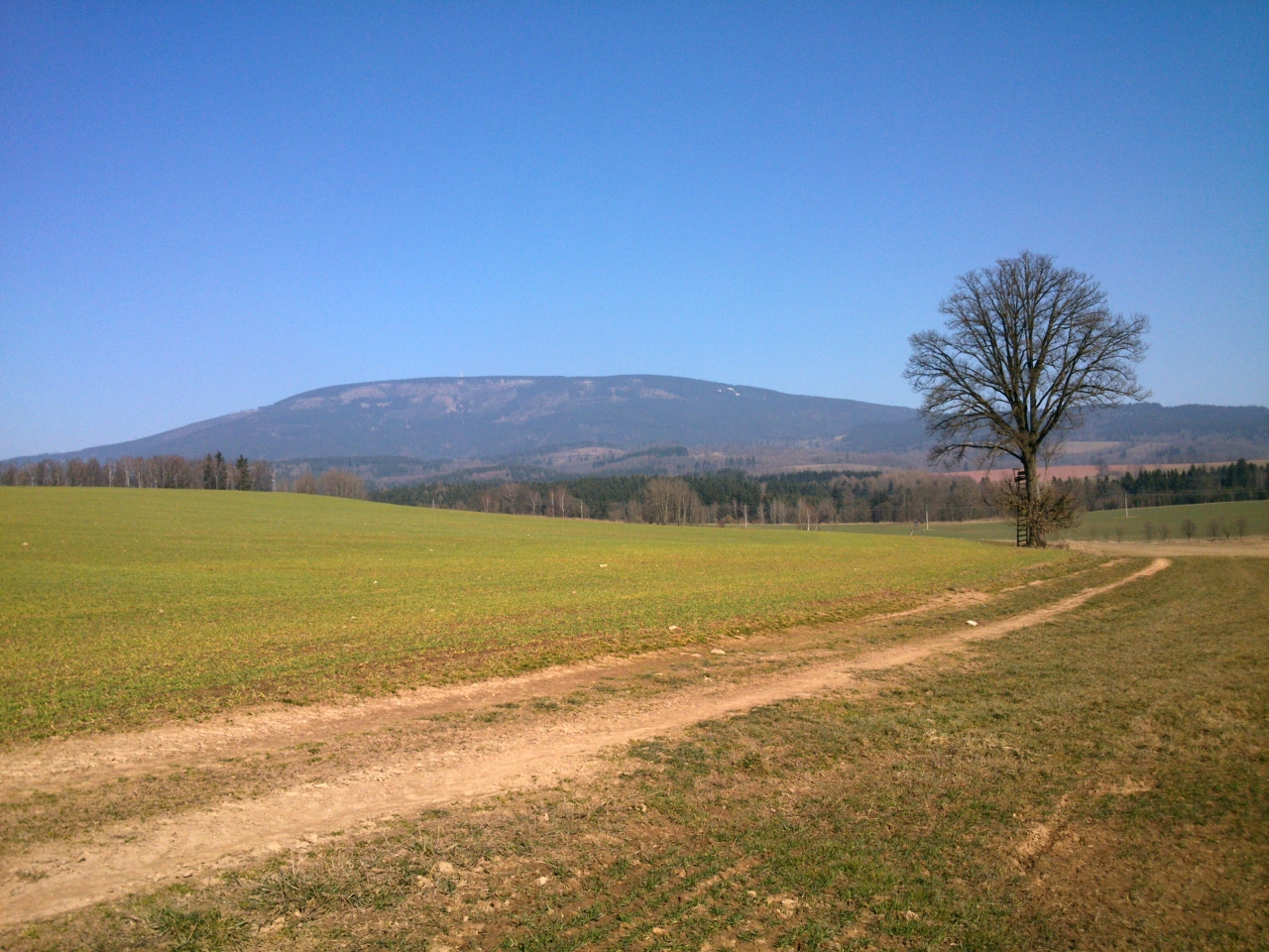 Odbočíme doprava po této cestě, projdeme hájkem až na louku a zde se po více či méně znatelné cestě stočíme doleva souběžně s okrajem lesa až k prvním domům, které vidíme před sebou. Tady začíná solidnější cesta po které sledujeme vrchol pohoří. I odtud je občas pěkný výhled.