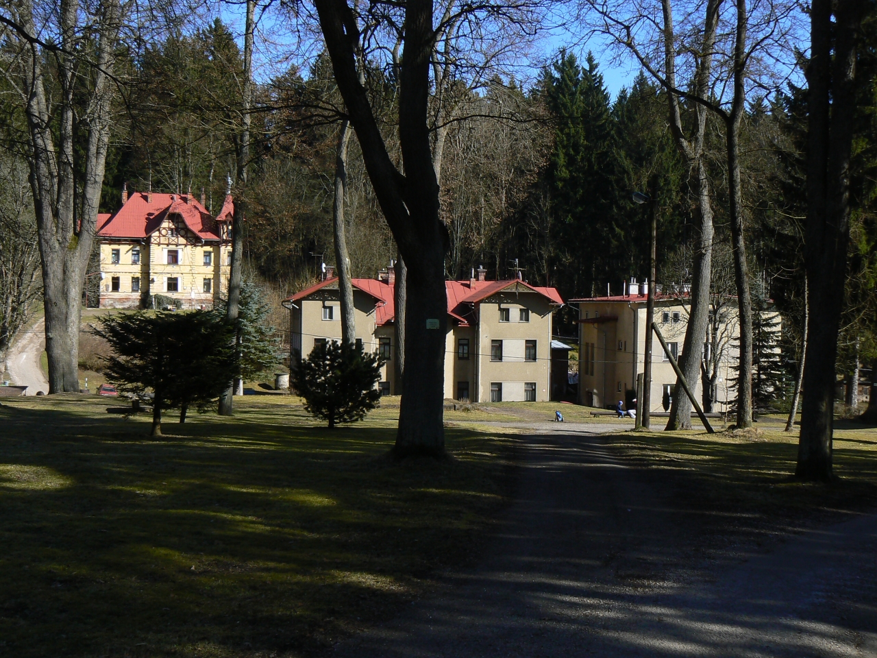 b) Jde se přes Hoffmanovy Boudy (...) přes Zlatou Vyhlídku, Galgenberg a Hermanovy Seify do Lesní Lázně (také povozem), 423 m hojně navštěvované letní sídlo s levnějším a dobrým pobytem. Lázně. Žádná láz. taxa. Pošta a telegr.