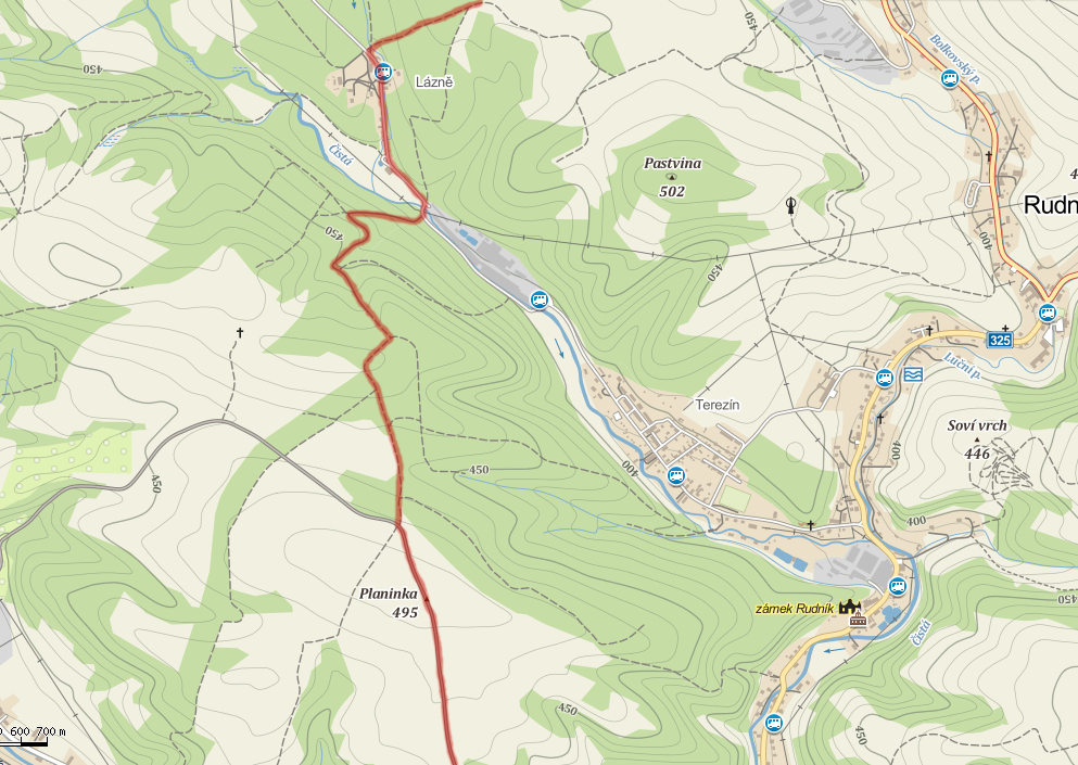 Od něj je to už jen kousek na hlavní silnici, kterou přejdeme a na opačné straně se vydáme vlevo. Naproti Národnímu domu se na stromech zachoval nevýrazný zbytek značky. Kousek za ním, naproti odbočce na Arnultovice a Rudník, odbočuje doprava úzká ulička Labská fortna. Na nárožních kamenech plotu na její pravé straně je červená šipka - poslední zbytek značky na naší cestě.