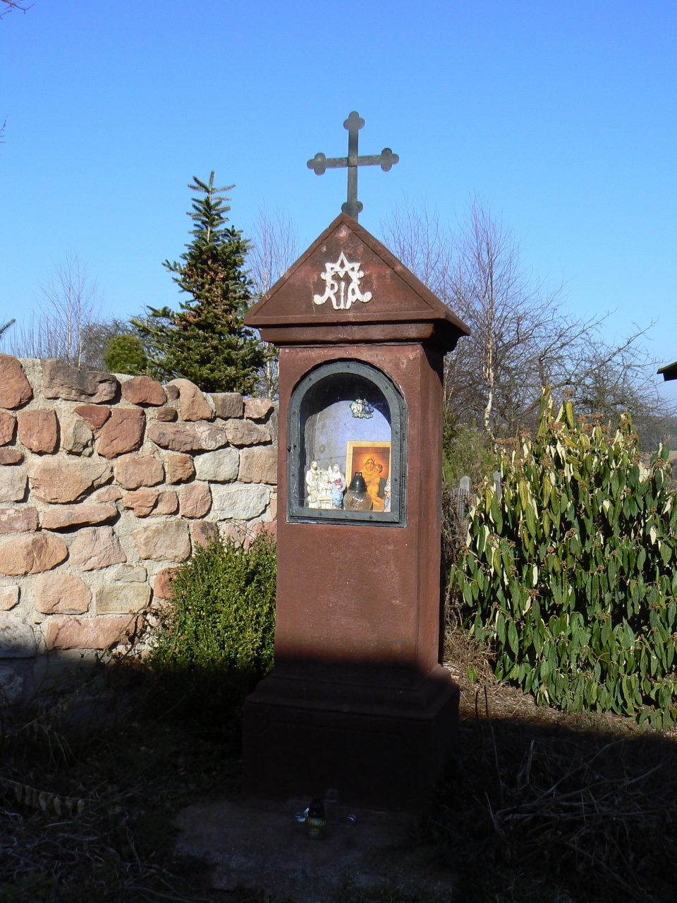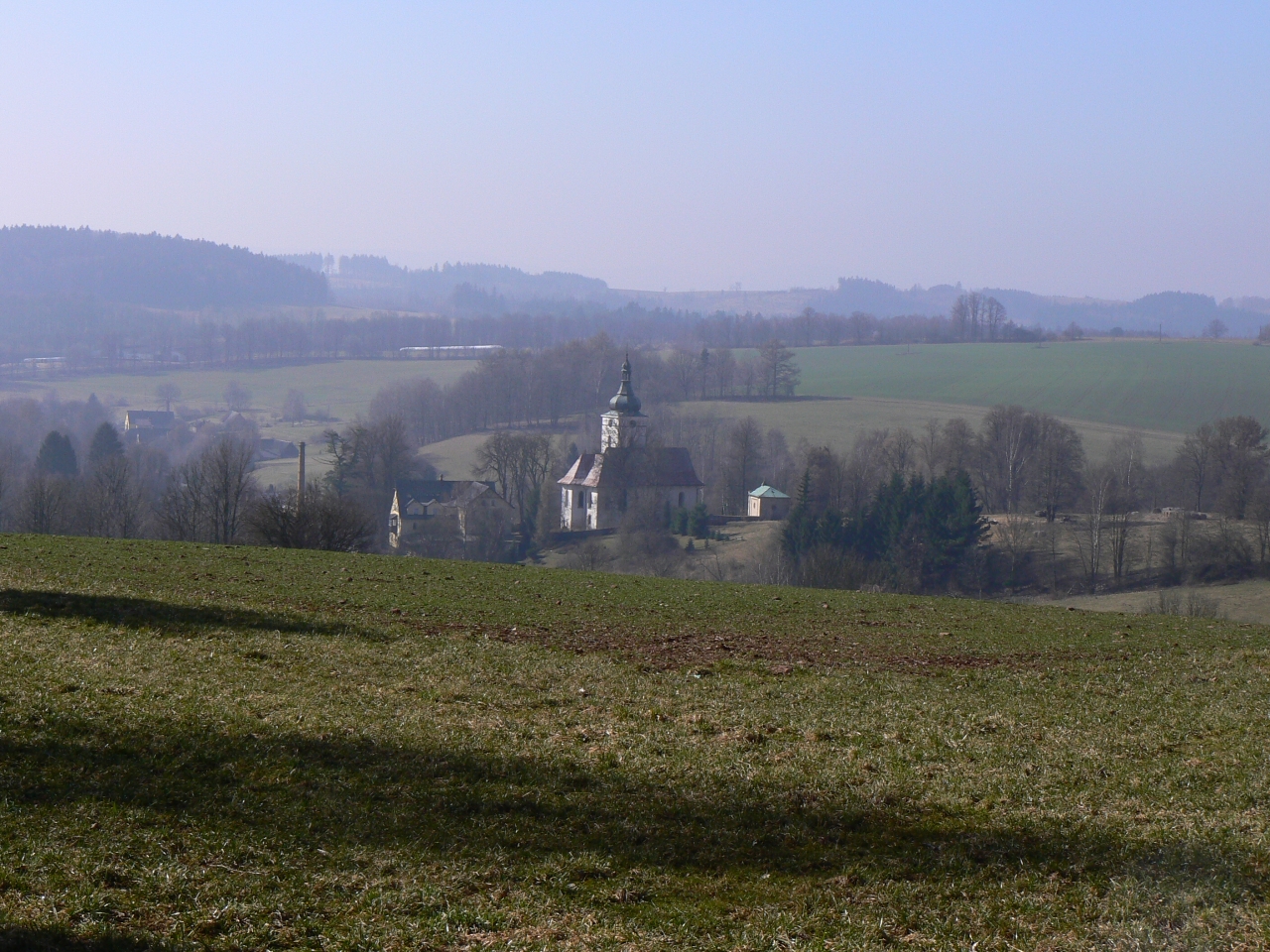 Podle průvodce Krkonoše a Podkrkonoší z roku 1968 někde nad kostelem značka ze silničky odbočovala doprava a vedla dolů do údolí ke kostelu a pak dál po silničce údolím. Není tu však žádná zjevná cesta a dole bychom pravděpodobně skončili v zahradách domů, proto půjdeme dál po silničce tak, jak značka vedla podle mapy Krkonoš z roku 1959.