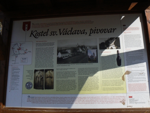 Silnička dole ústí na hlavní silnici, na které odbočíme vpravo a pár kroků nás přivede až do prudké levotočivé zatáčky u pivovaru a kostela, kde je i panel se zajímavým povídáním o historii kostela i pivovaru.
