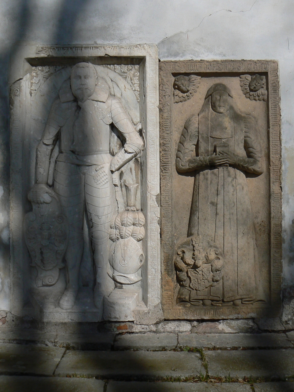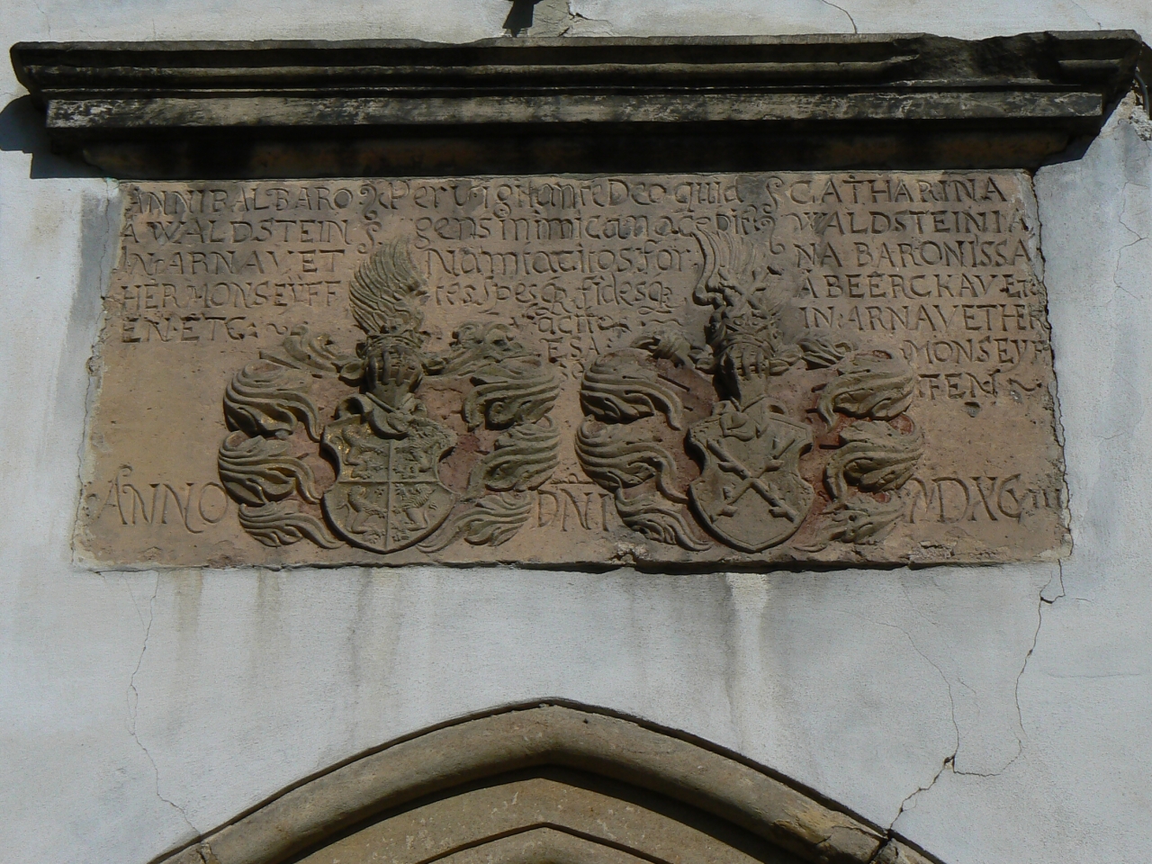 Nad lomeným vchodem do věže jsou zasazené do zdi i erby rodů obou manželů.