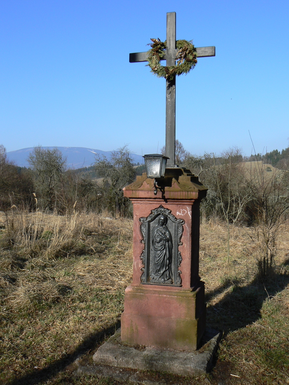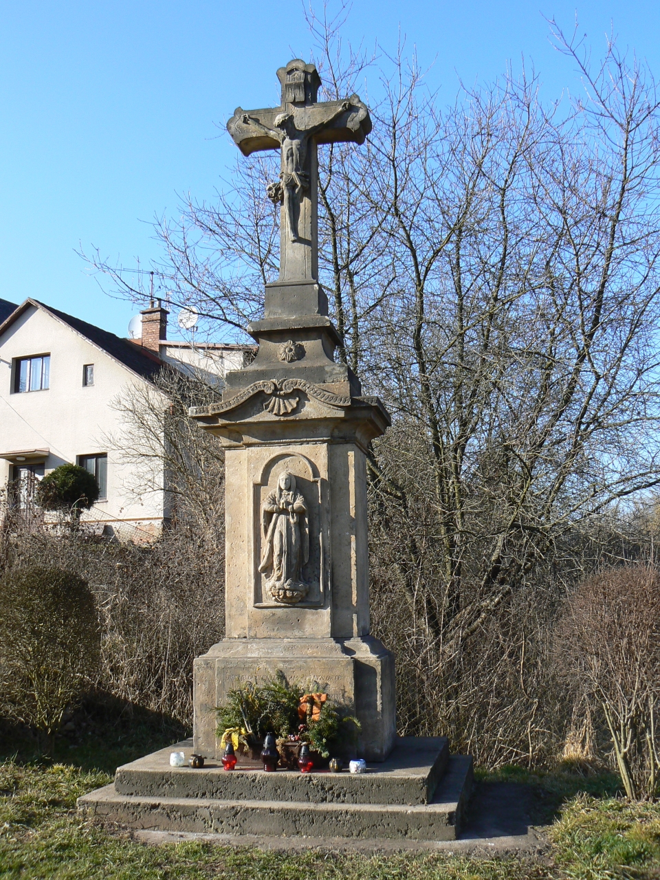 Dole pod kopcem je nádherně opravený kamenný kříž.