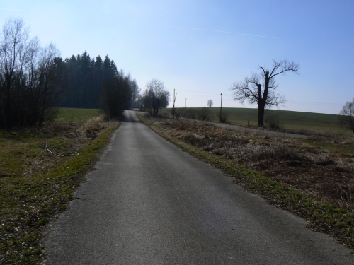 Sejdeme dolů z mírného kopce až k malému hájku na pravé straně silničky až na místo, kde doprava odbočuje cesta.