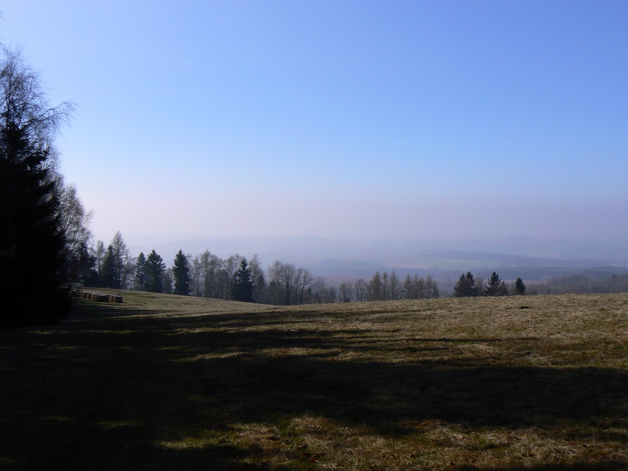 Po nedlouhé cestě vyjdeme z lesa a pokračujeme po cestě podél zarostlé uvozové cesty. Když je pěkné počasí, jsou odtud krásné výhledy na většinu Podkrkonoší. Dnes hezky sice je, ale bohužel také mlha, která je moc hustá na to, aby bylo něco vidět a moc řídká na to, aby byla zajímavá sama o sobě. Lepší obrázek bohužel nemám, budu sem muset asi vyrazit ještě jednou.