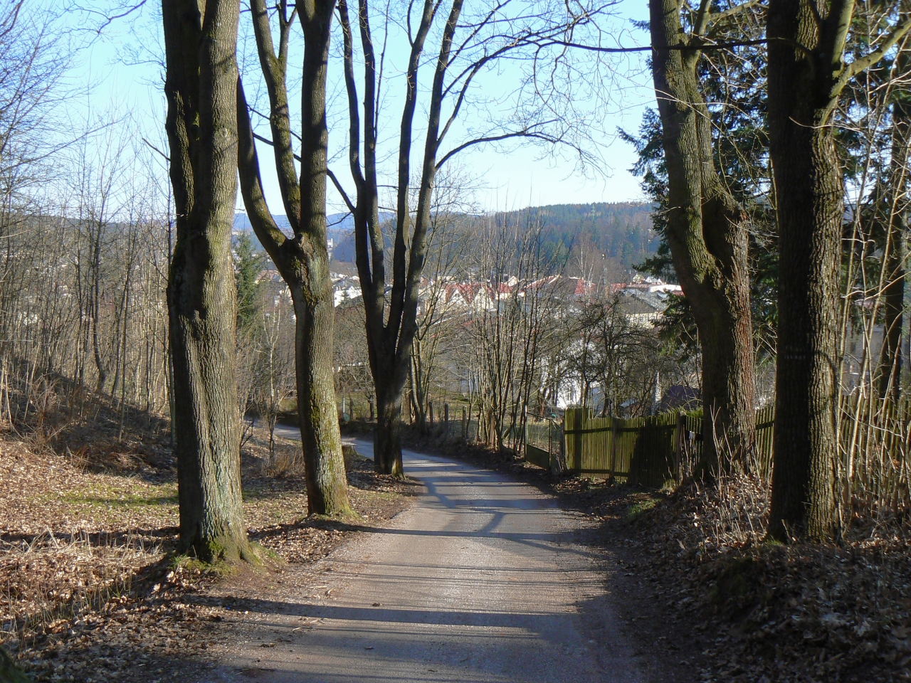 Těsně nad Hostinným začíná silnička prudčeji klesat a vede skrz pěknou alej.