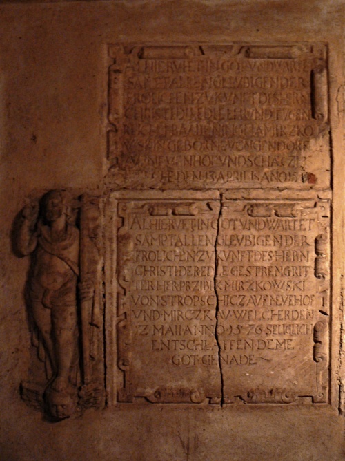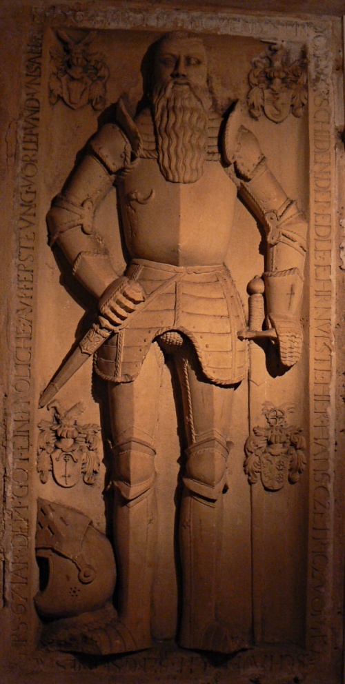 Vedle je zasazen náhrobek, z něhož na nás hledí kamenný rytíř v plné zbroji.