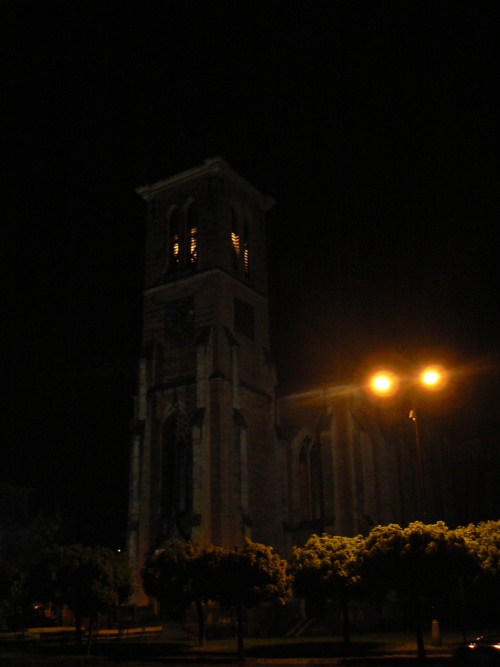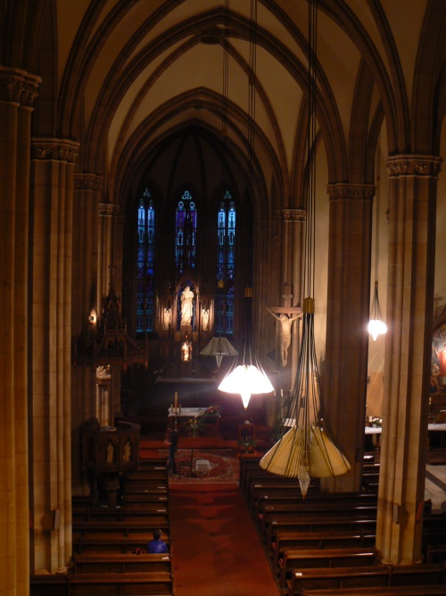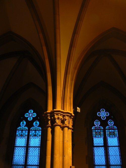 Nad kostelem nebe pomalu mění barvu z podmračené šedé na sametovou barvu noční tmy a my procházíme kostelní předsíní, dveřmi ze skla a dřeva a... už jsme tam, pod vznosnou lomenou klenbou nesenou štíhlými sloupy, k níž stoupal už nespočet modliteb i nadějí, že budou vyslyšeny.
