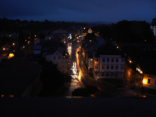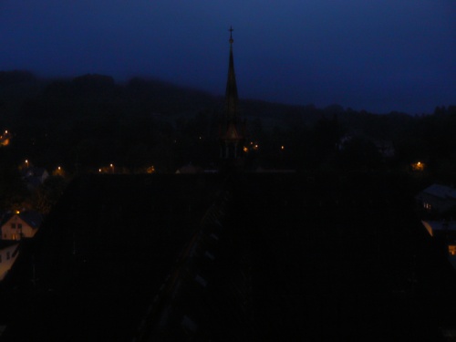 V kostele bude za chvíli začínat koncert Vrchlabského chrámového sboru, ale mně se dolů nechce. Atmosféra noční věže, její světla a stíny, tichounké šumění deště i zvony jako mlčenliví strážci města... to všechno budí krásný pocit v nitru, chuť stanout tady a snít...