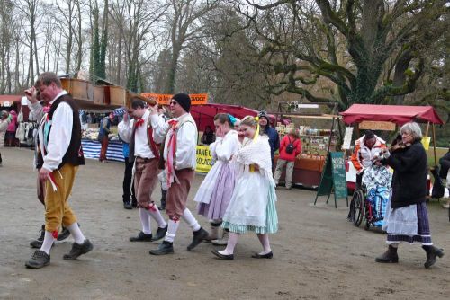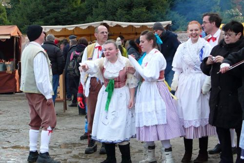 Někteří zatím mizí ven - neochotně na sebe beru svou ryze moderní bundu, která se k horalskému kroji nehodí ani trochu, mráz mě však k tomu nutí - a toulám se po jarmarku. Ten se odehrává na stejné straně zámku, kde budeme i my a Horačky vystupovat - na širokém prostranství na začátku krásného zámeckého parku.