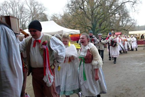 Dlouho tam však nepobudu... mám žízeň a kdepak žízeň na masopustu. Hned vedle vchodu mě zaujme stánek s různými lahůdkami a nejvíc mi do oka padne zelňačka. To je přesně to, na co mám teď chuť. Hned si objednávám plnou misku a k ní pivo... lidičky kolem se na mě usmívají a někteří si mě i fotografují. Horalský kroj se jim líbí. A mně to dělá obrovskou, neskutečnou radost. Také si rád prohlížím a fotografuju ty krásné lidi, co nám dělají radost hudbou a tancem... dneska poprvé v životě zažívám, jak krásné to je být jedním z nich.