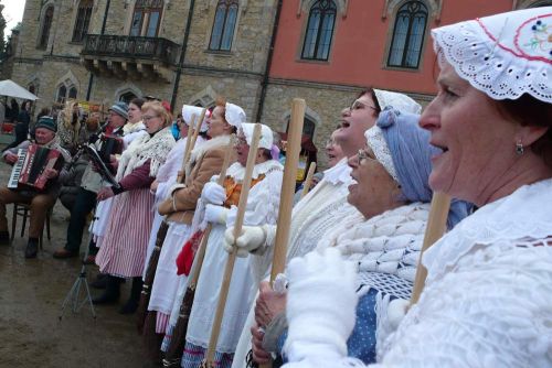 Přátelsky se tu s námi zdraví druhý folklórní soubor, se kterým dnes budeme společně dělat lidem radost povídáním, hudbou, zpěvem a tancem - soubor Horačky z Hodkovic nad Mohelkou. Hezky to pořadatelé Zámeckého masopustu vybrali - Horal a Horačky. Horačky (i několik Horáků) jsou už převlečené do svých krásných krojů i typických masopustních kostýmů a je na ně pěkné podívání. Není však čas na otálení a koukání - kdy budeme vystupovat, to zatím nevíme, tak se snažíme připravit co nejrychleji. Obzvlášť nesmí otálet ti jedinci, co se zatím do kroje nasoukali jen jednou v životě. Rychle si hledám v přeplněné místnosti místečko pro sebe, stahuju své běžné oblečení... natahuju podkolenky, zapínám početné knoflíčky na kalhotách, který nemají žádný běžný poklopec, ale takový ten, co se mu někdy říká „padací most“, beru vestičku, uvazuju pod krk červenou mašličku... mezi tím se dozvídáme, že času je habaděj - první budou vystupovat Horačky v 9:20 a my až za hodinu po nich, takže není kam spěchat.