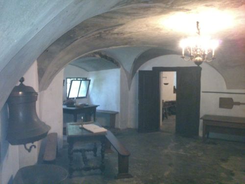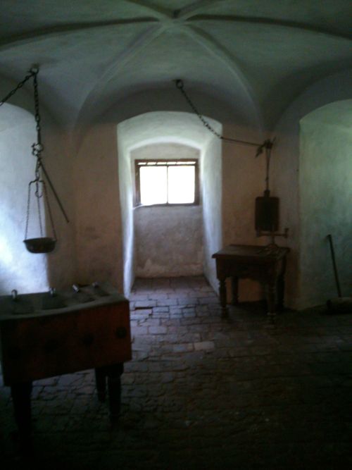 Vedlejší místnůstka je vlastně suterénem zámecké věže a je to bourárna. Sem přinesli vykuchaného vola nebo prase a řezník či kuchmistr si ho tu naporcoval přesně jak potřeboval. Nechybí tu ani těžká dřevěná palice, kterou se porážel dobytek nebo se s ní dávala narkóza zámeckému pánovi, když ho bolel zub.