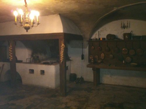 Nezdálo se mi, že by byl v kuchyni takový krásný, zdobený krb... ale asi se opravdu z někdejší parádní místnosti kuchyně stala, protože v krbu je tyč na zavěšování kotlů a hrnců i háky na uzení masa.